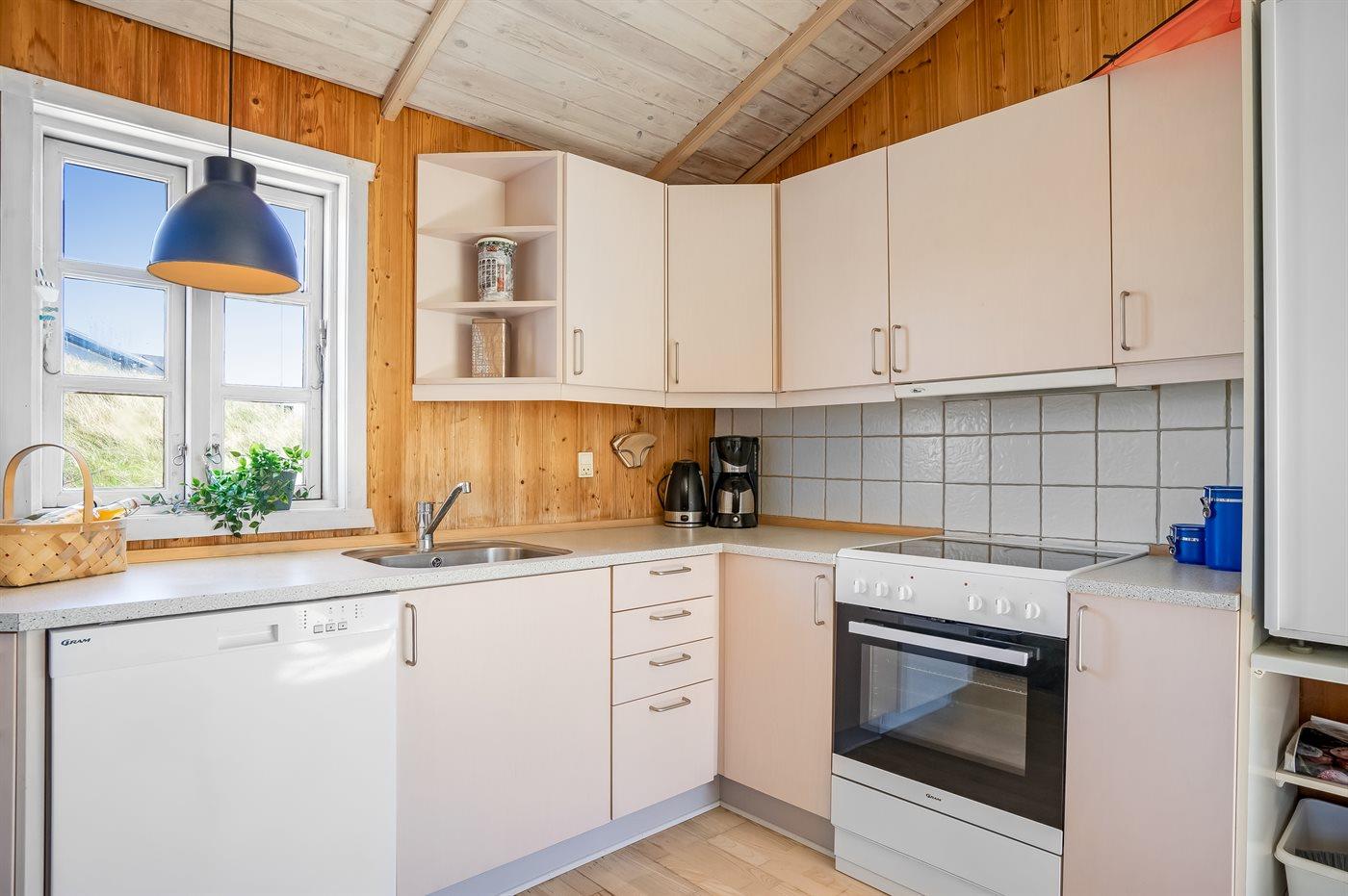 Køkkenet er udstyret med 1 køleskab. Der er 4 elkogeplader, bageovn samt opvaskemaskine.