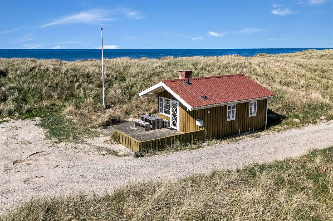 Hyggeligt lille sommerhus beliggende i yderste række og lige bag klitterne til stranden og Vesterhavet på en kuperet grund med udsigt til vandet fra grunden. Huset ligger på en blind vej i et attraktivt sommerhusområde tæt på nedkørslen til stranden og nær Løkken by, og er indrettet med hems.