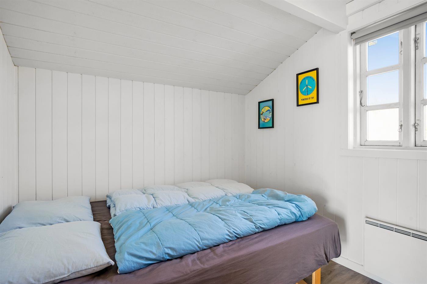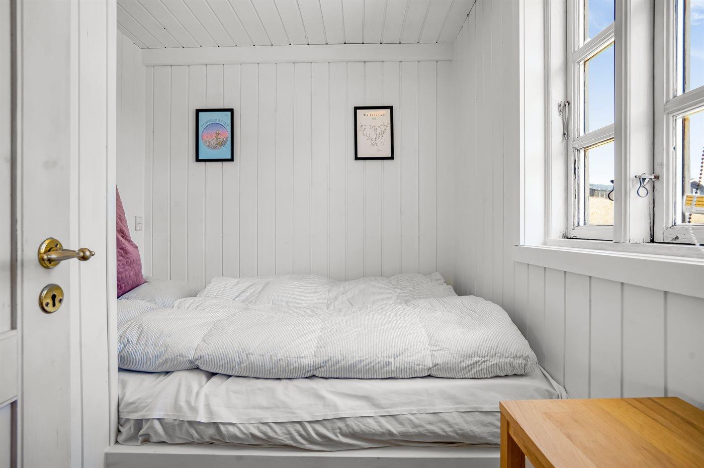 Der er i alt 2 soveværelser. Sovepladserne fordeler sig på: 2 sovepladser i dobbeltseng. 1 soveplads i enkeltseng. 2 sovepladser på madrasser. 2 af disse sovepladser befinder sig på husets hems.