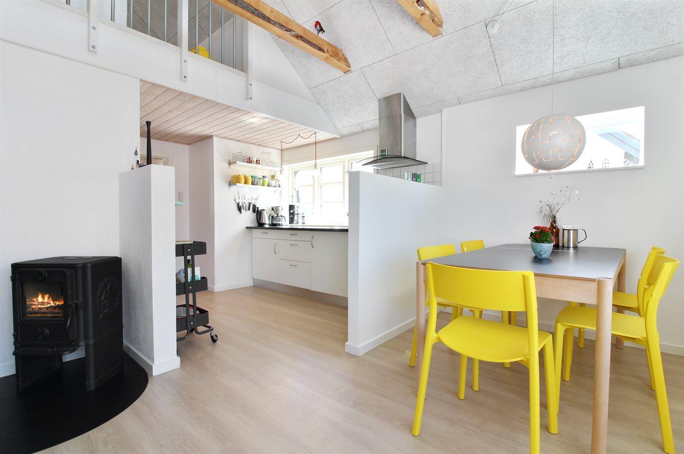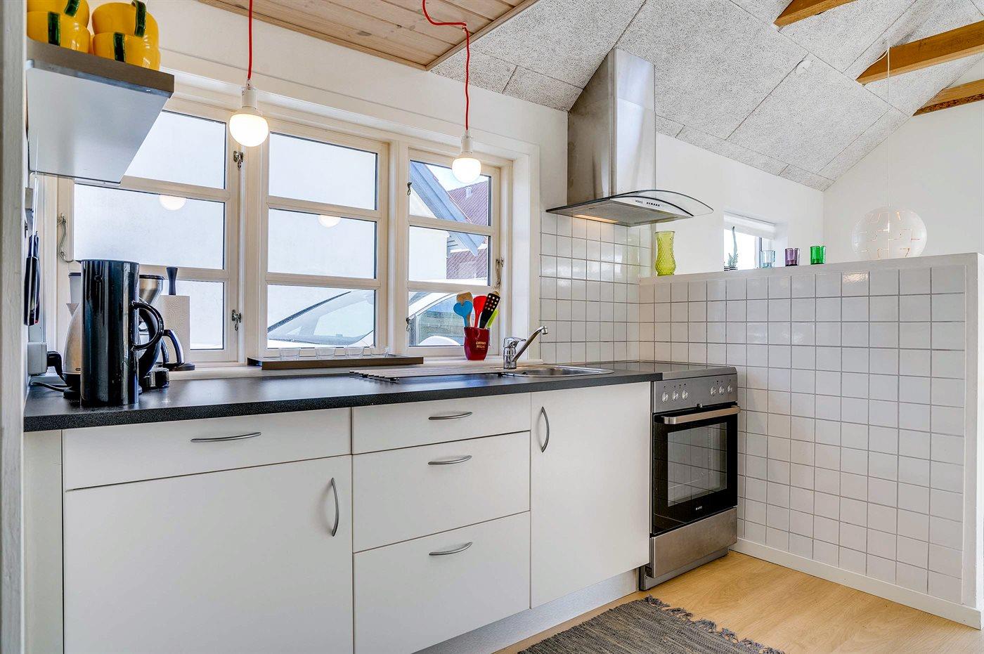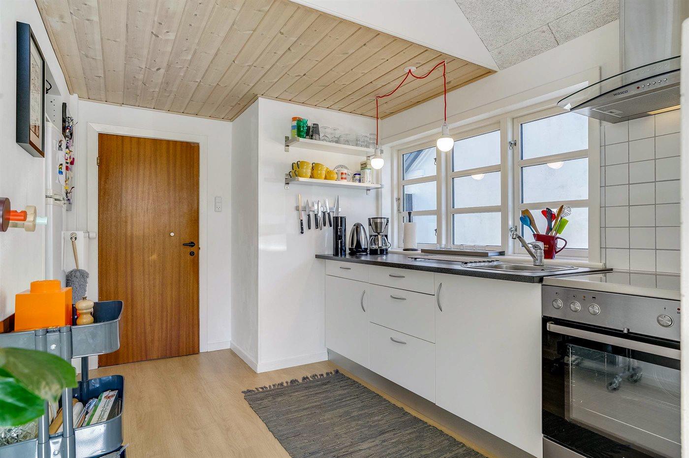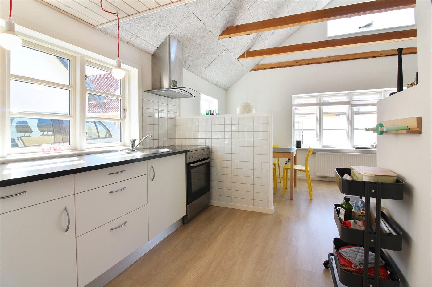 Køkkenet er udstyret med 1 køleskab. Der er 4 keramiske kogeplader, varmluftovn.