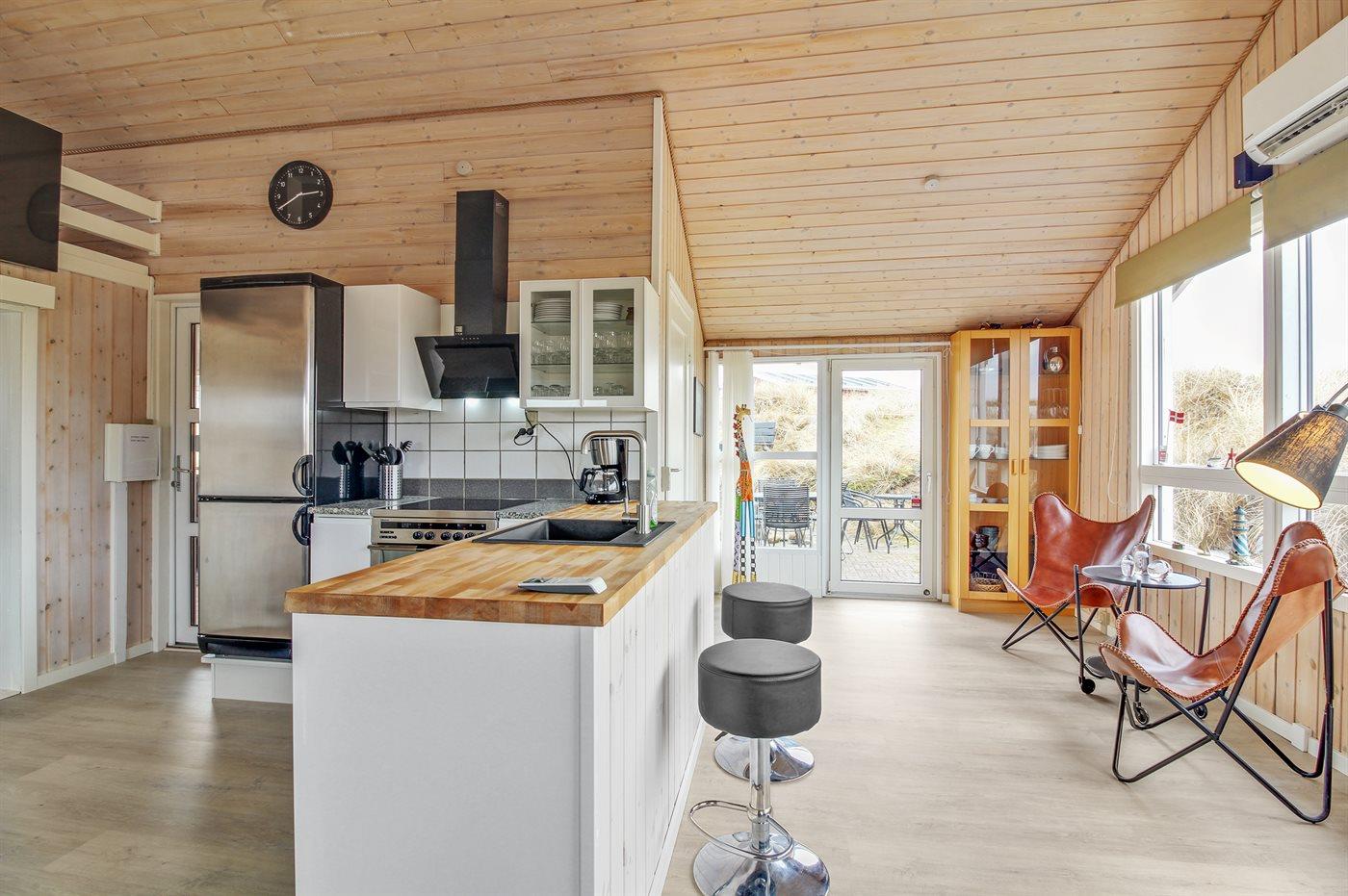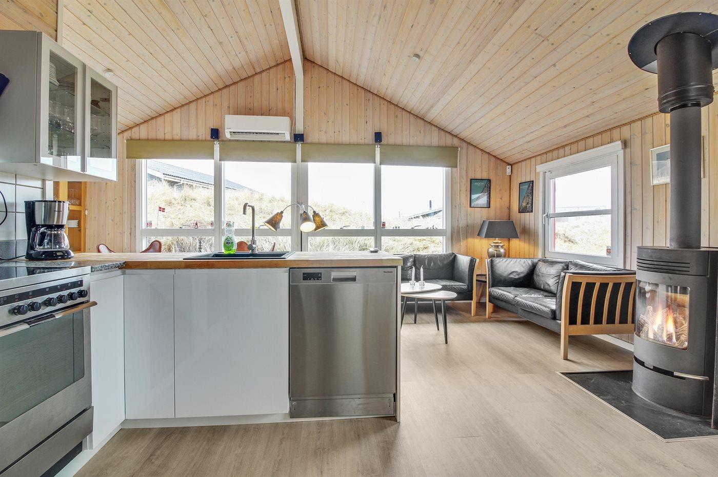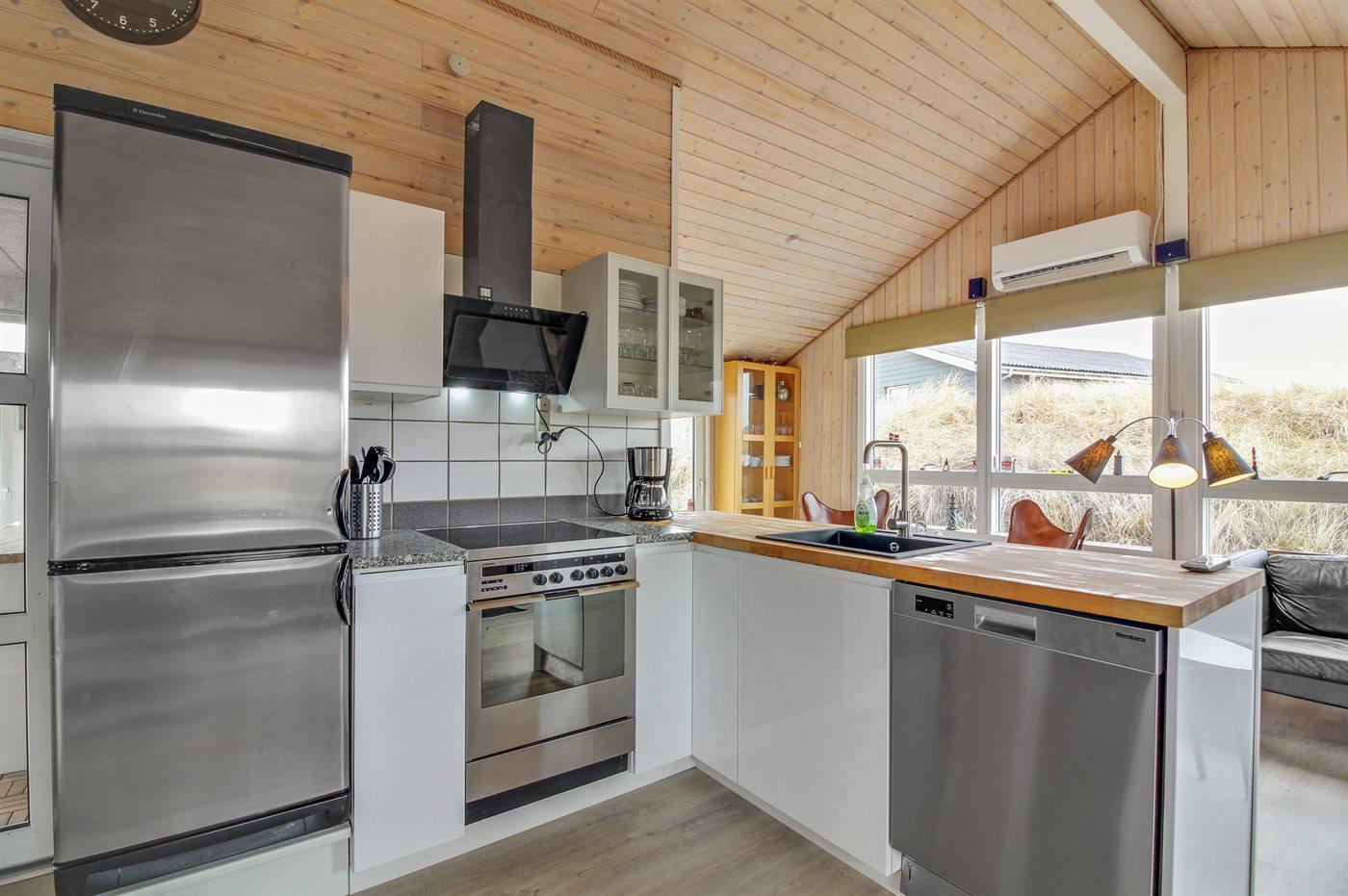 Køkkenet er udstyret med 1 køleskab. Der er 4 keramiske kogeplader, varmluftovn, mikrobølgeovn samt opvaskemaskine.