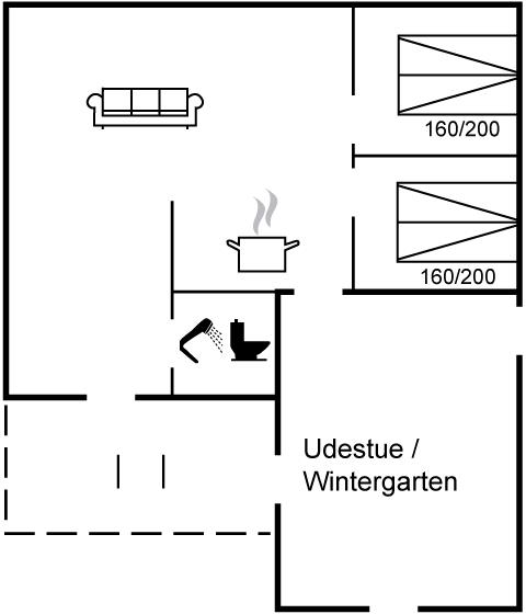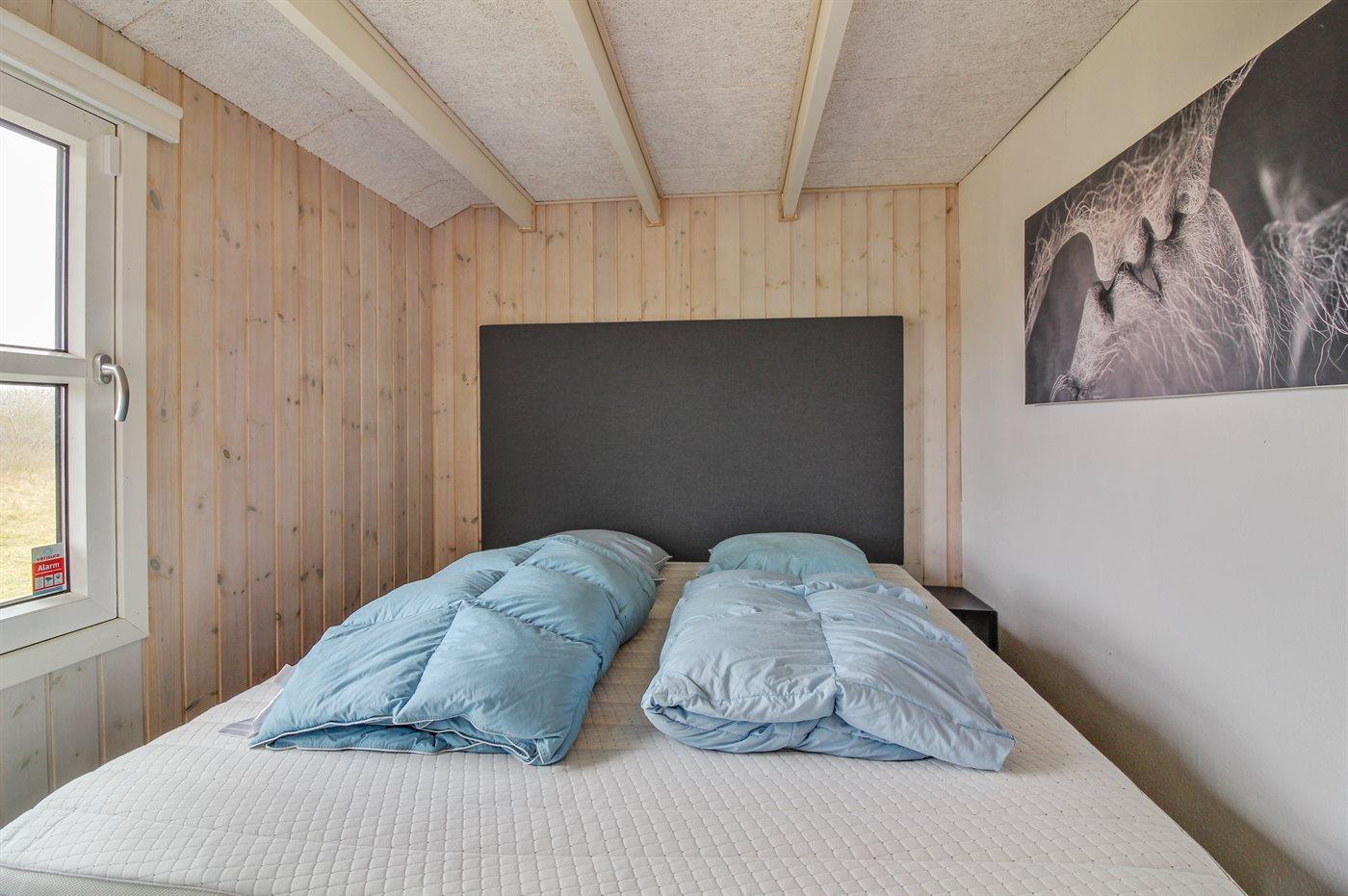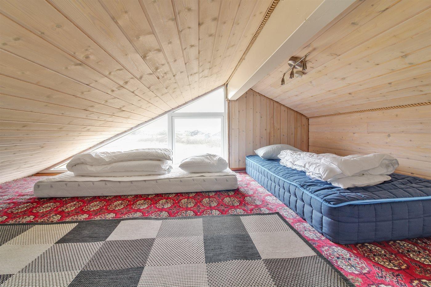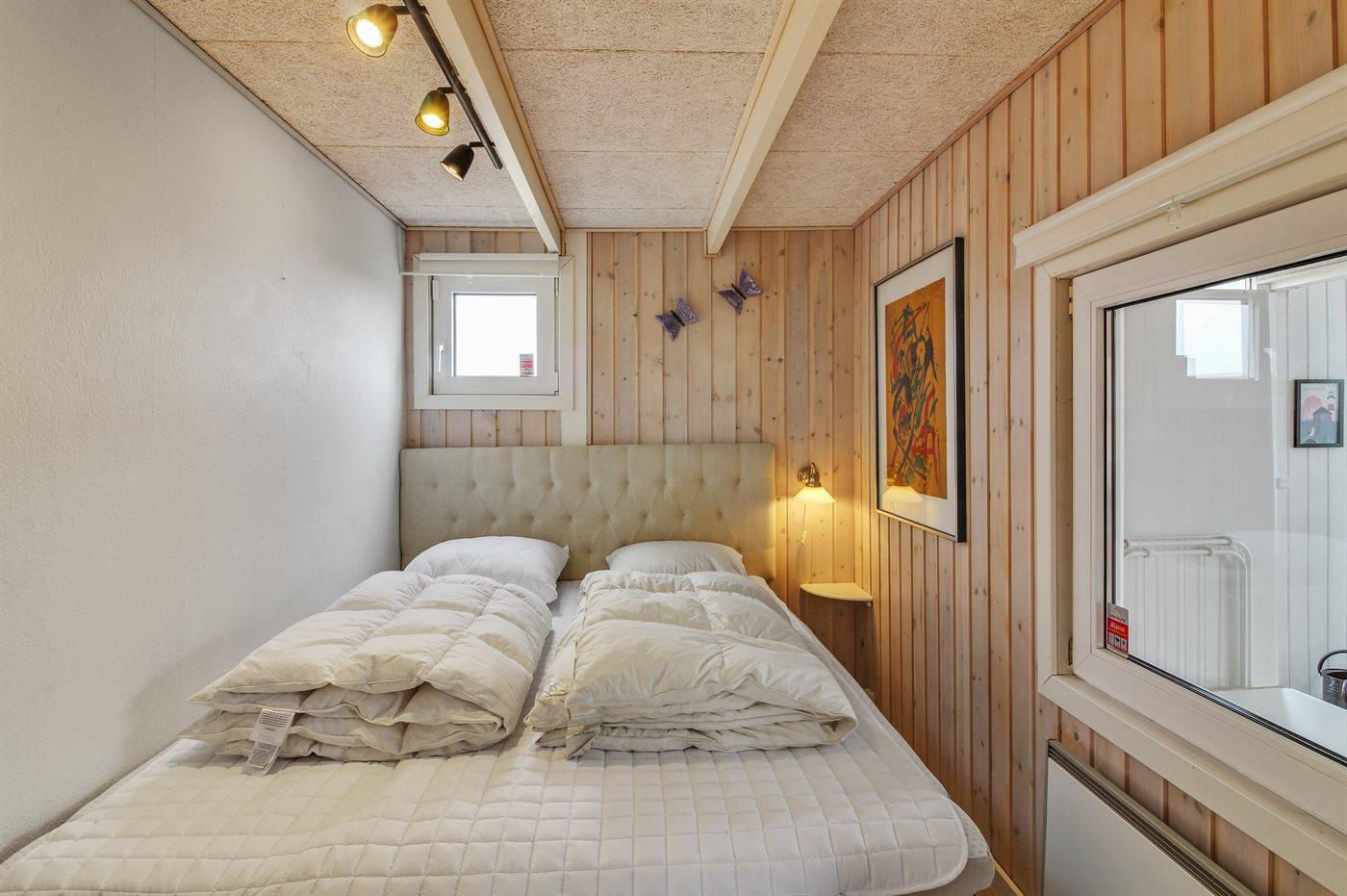 Der er i alt 2 soveværelser. Sovepladserne fordeler sig på: 4 sovepladser i dobbeltsenge. 2 sovepladser på madrasser. 2 af disse sovepladser befinder sig på husets hems og er bedste egnet til større børn.