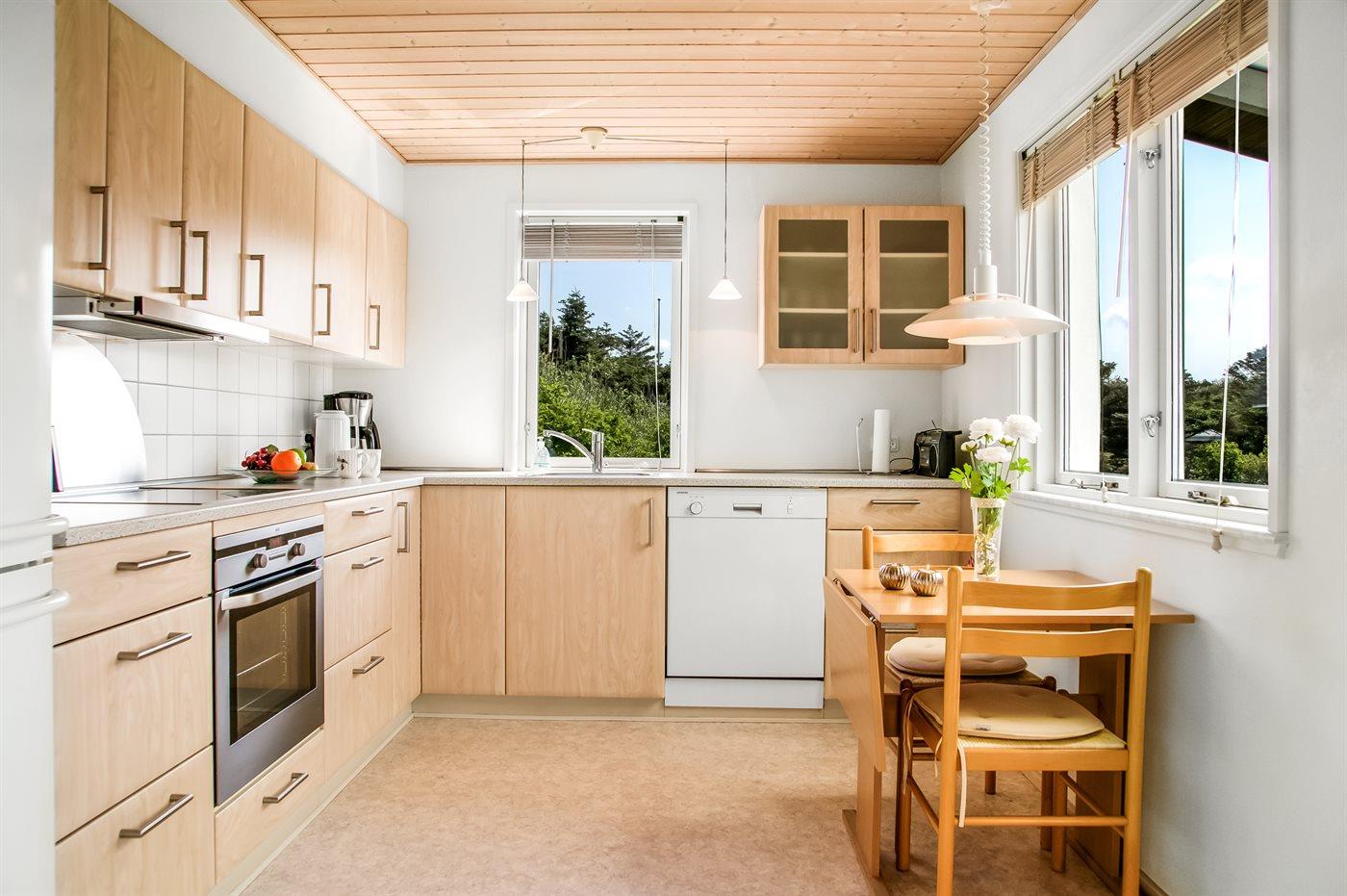 Køkkenet er udstyret med 1 køleskab. Der er 4 keramiske kogeplader, varmluftovn, mikrobølgeovn samt opvaskemaskine.