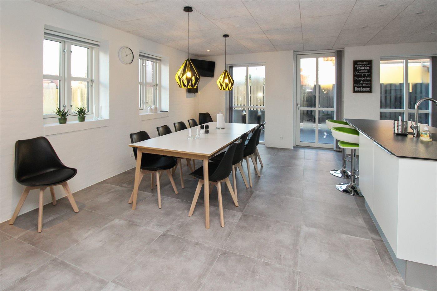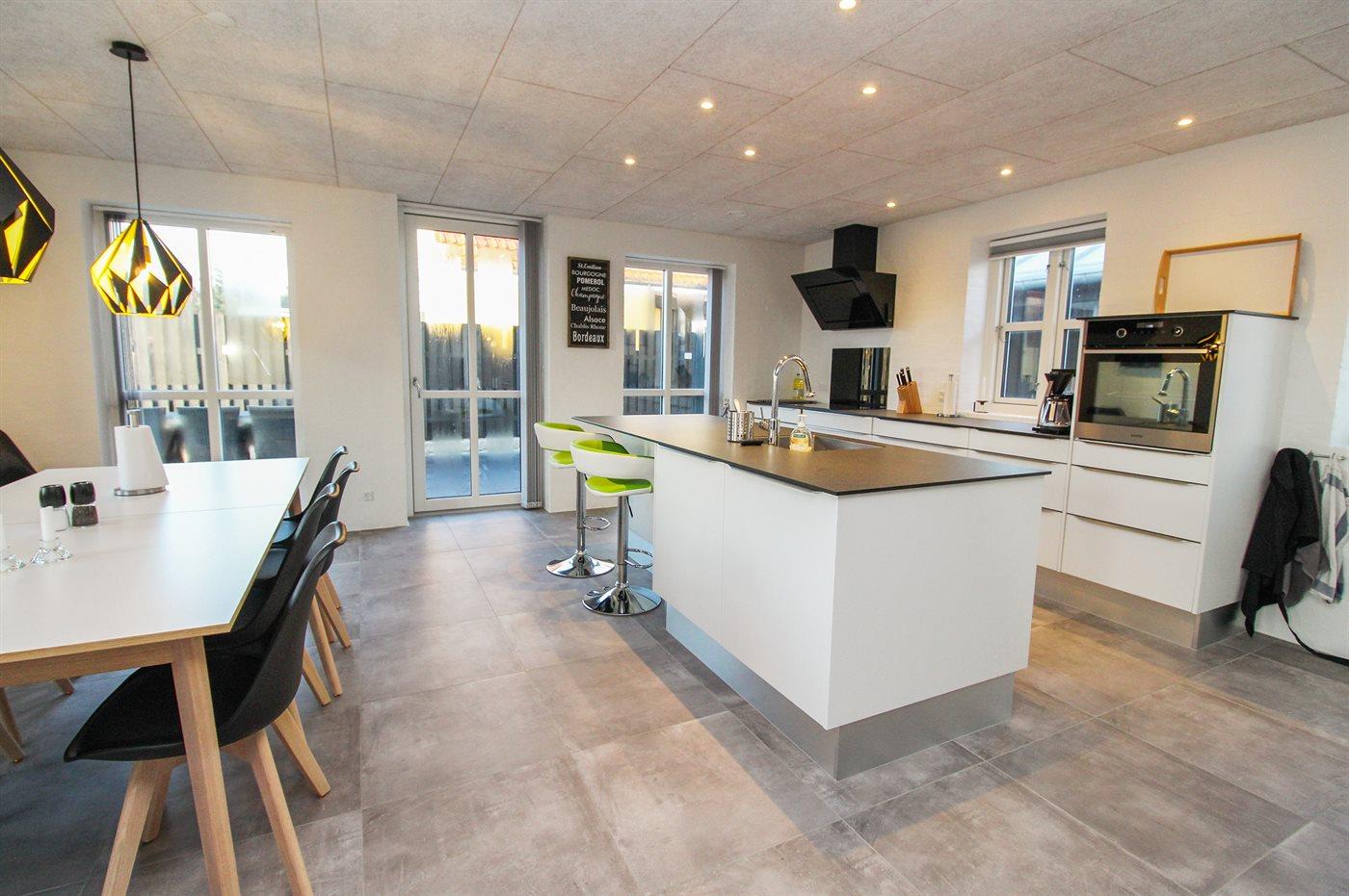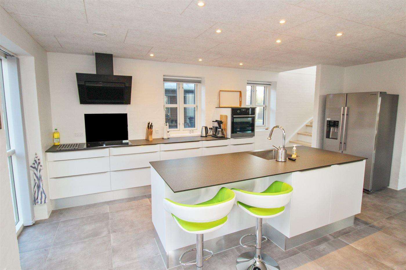Køkkenet er udstyret med 1 amerikansk køleskab. Der er 4 induktionskogeplader, varmluftovn, mikrobølgeovn samt opvaskemaskine.