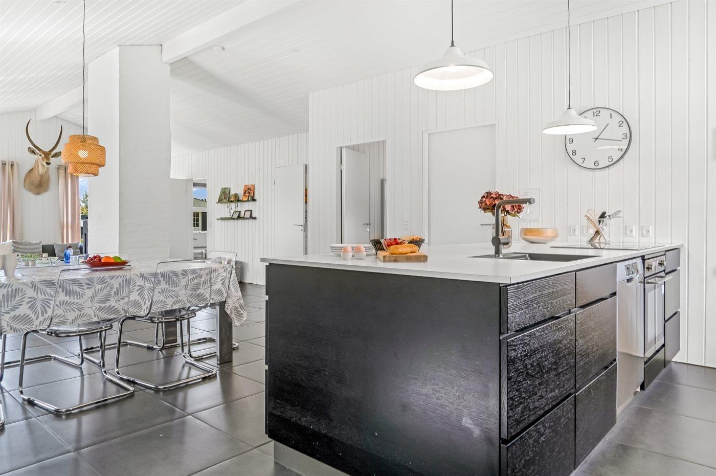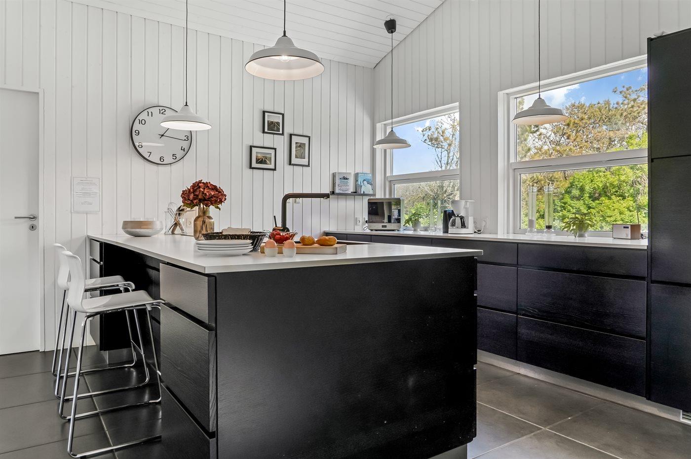 Køkkenet er udstyret med 1 køleskab. Der er 4 keramiske kogeplader, varmluftovn, mikrobølgeovn samt opvaskemaskine.