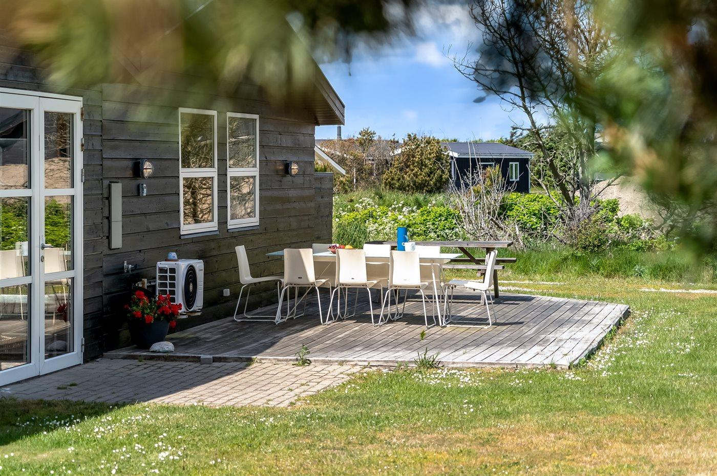 Ferieboligen er beliggende på en 1500 m² stor naturgrund. Der er 600 m til havet. Nærmeste forretning er beliggende i en afstand af 1000 m. Til ferieboligen hører 40 m² terrasseareal. Heraf i alt 40 m² lukket terrasse. Grill til rådighed. Parkering ved ferieboligen.