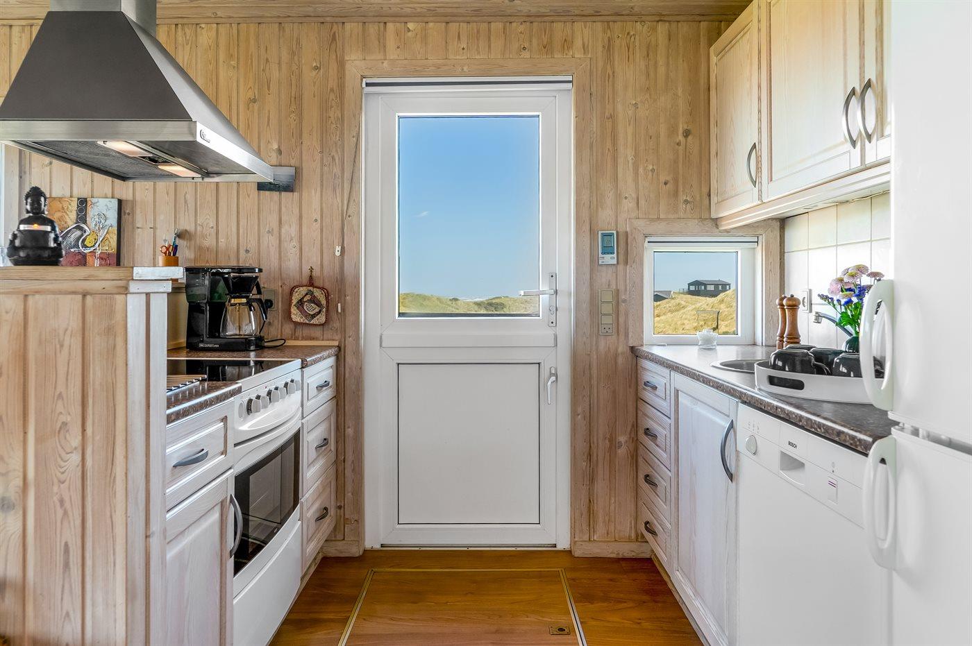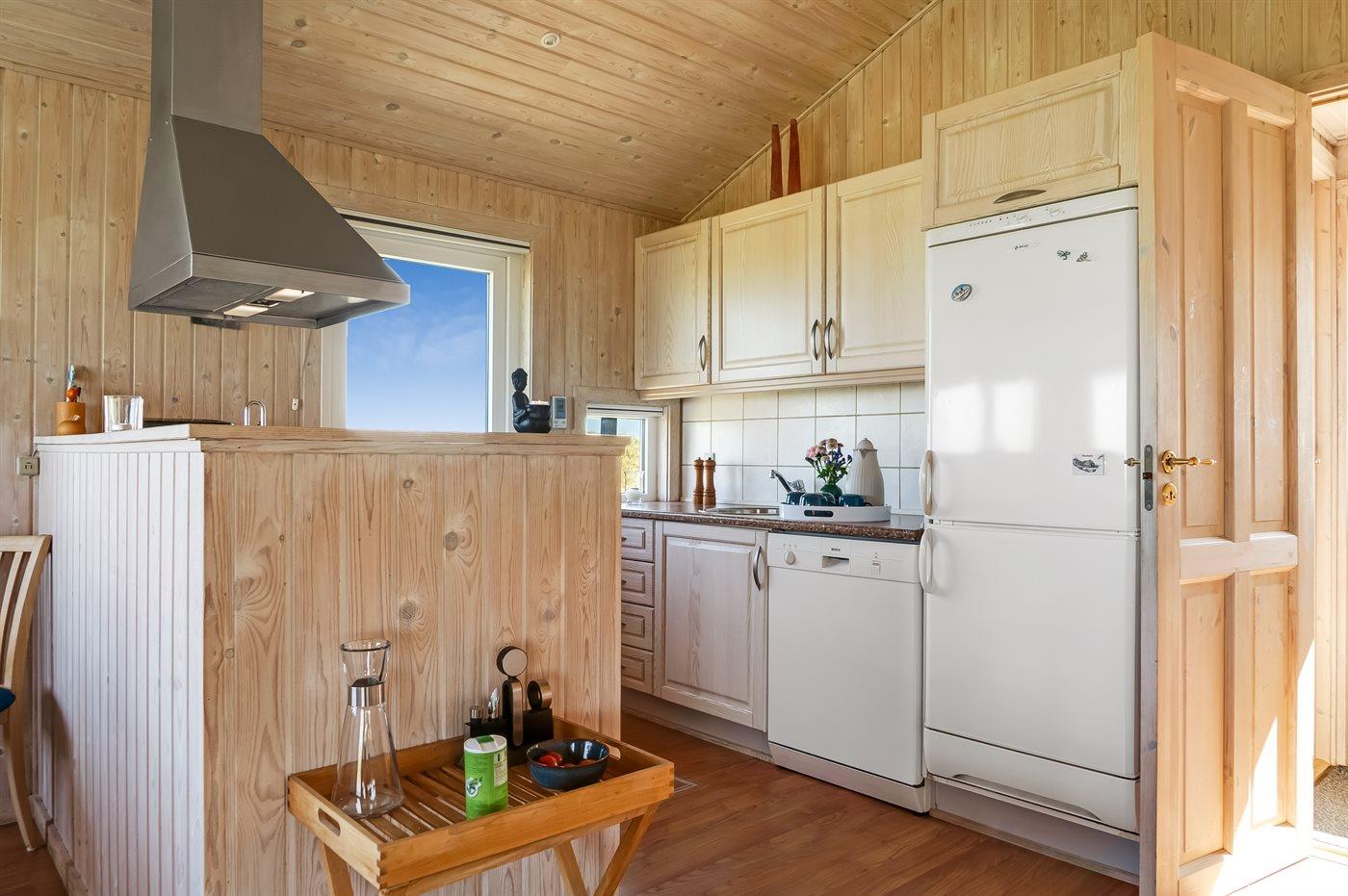 Køkkenet er udstyret med 1 køleskab. Der er 4 keramiske kogeplader, varmluftovn, mikrobølgeovn samt opvaskemaskine.