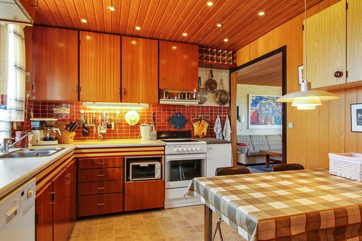 Køkkenet er udstyret med 1 køleskab. Der er 4 keramiske kogeplader, miniovn, varmluftovn, mikrobølgeovn samt opvaskemaskine.