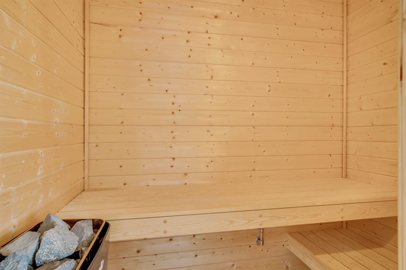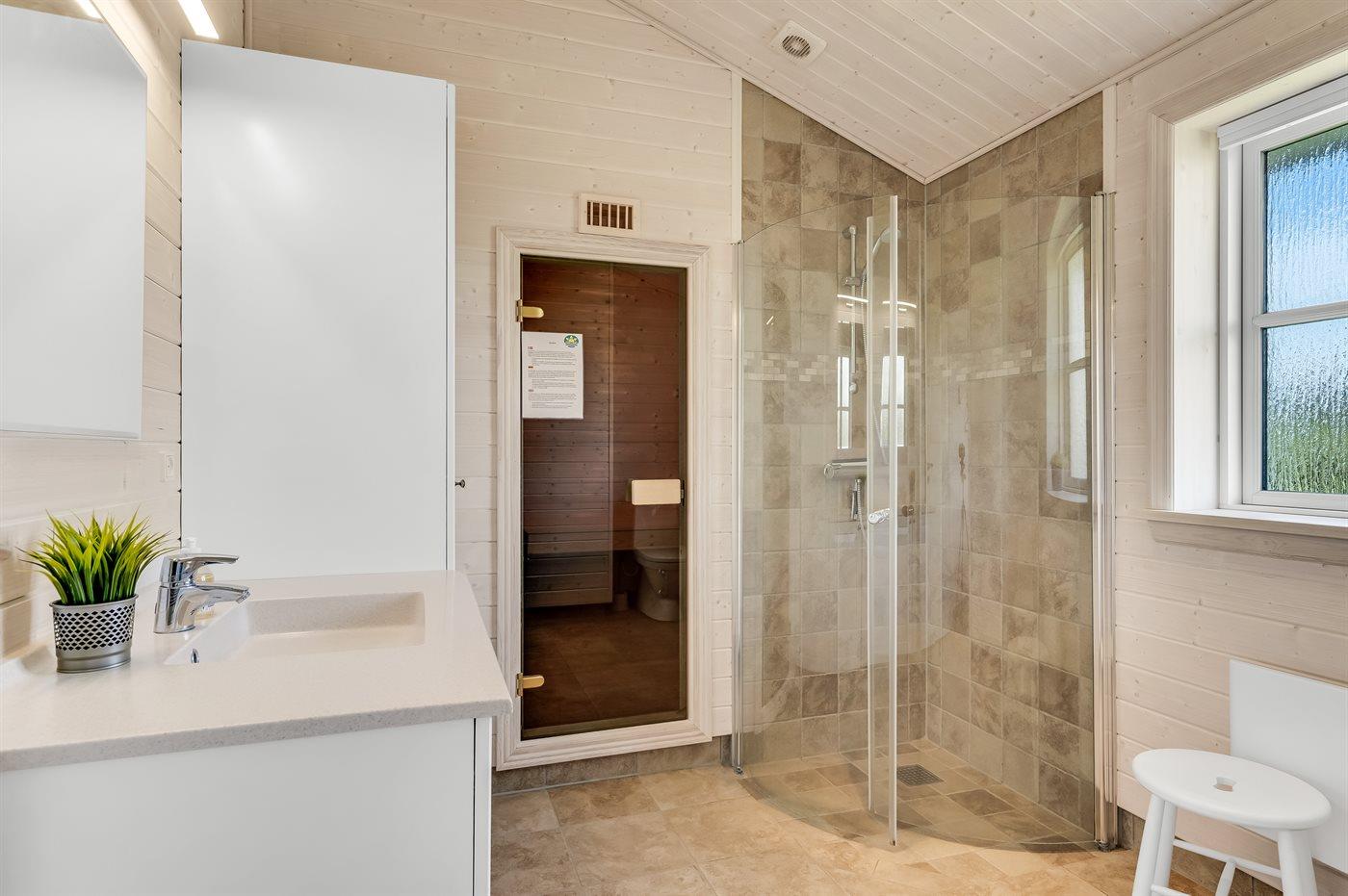Der er 1 badeværelse med bruseniche og 1 toilet.. Der er gulvvarme på 1 badeværelse. I saunaen er der mulighed for afslapning.