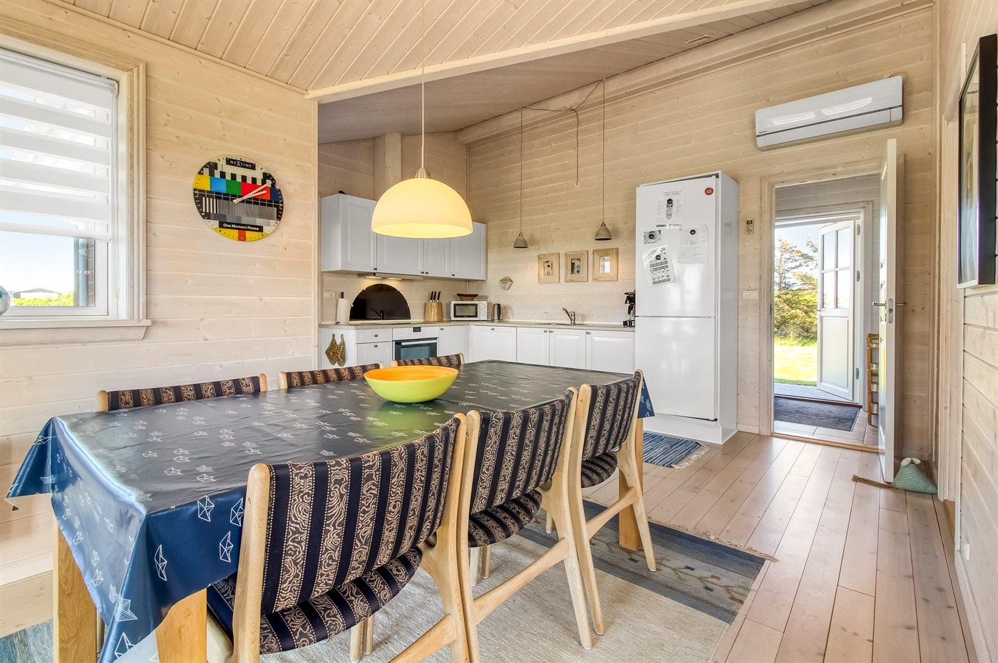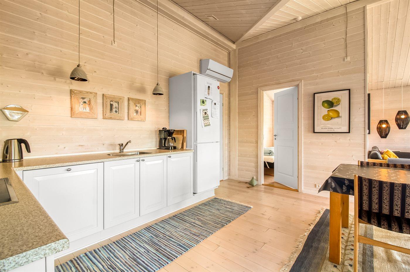 Køkkenet er udstyret med 1 køleskab. Der er 4 keramiske kogeplader, varmluftovn, mikrobølgeovn samt opvaskemaskine.