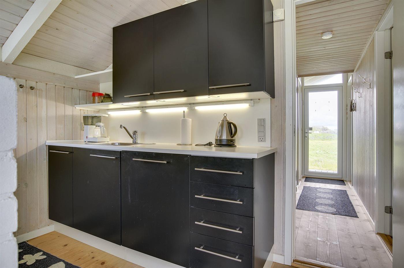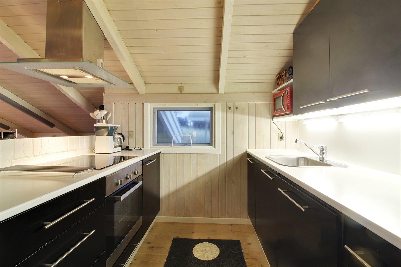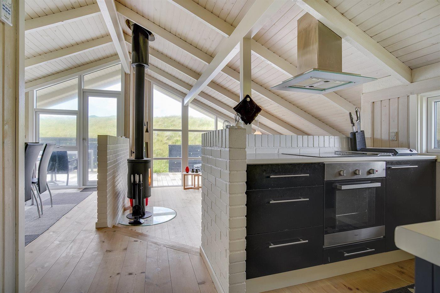 Køkkenet er udstyret med 1 køleskab. Der er 4 keramiske kogeplader, varmluftovn, mikrobølgeovn samt opvaskemaskine.
