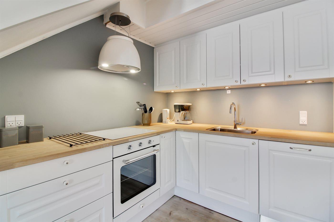 Køkkenet er udstyret med 1 køleskab. Der er 4 keramiske kogeplader, varmluftovn samt opvaskemaskine.