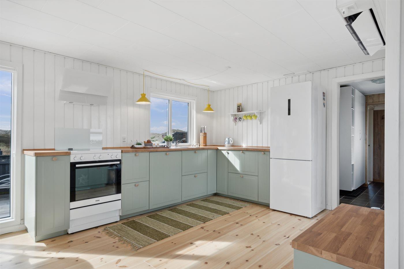 Køkkenet er udstyret med 1 køleskab. Der er 4 keramiske kogeplader, varmluftovn samt opvaskemaskine.