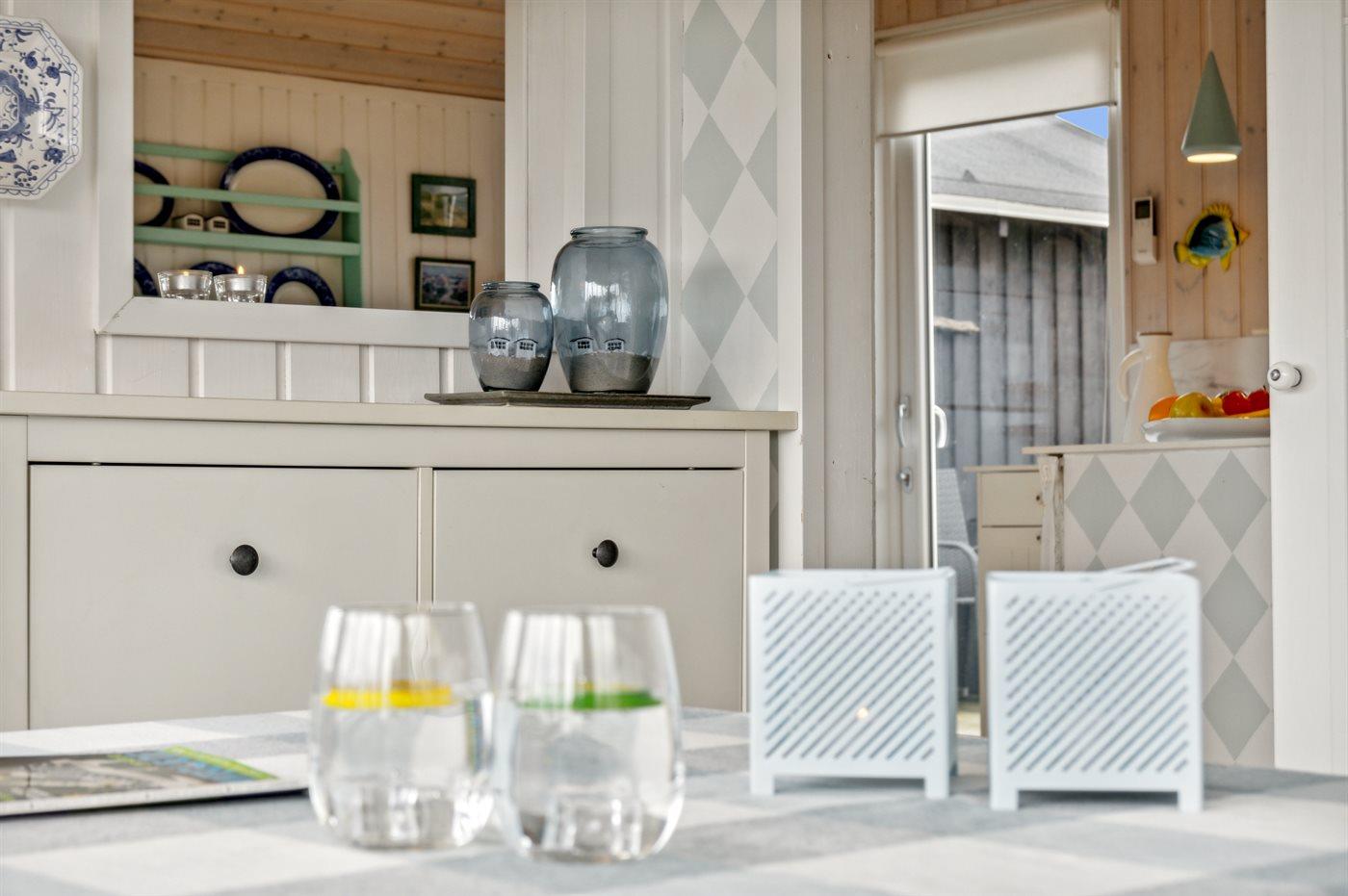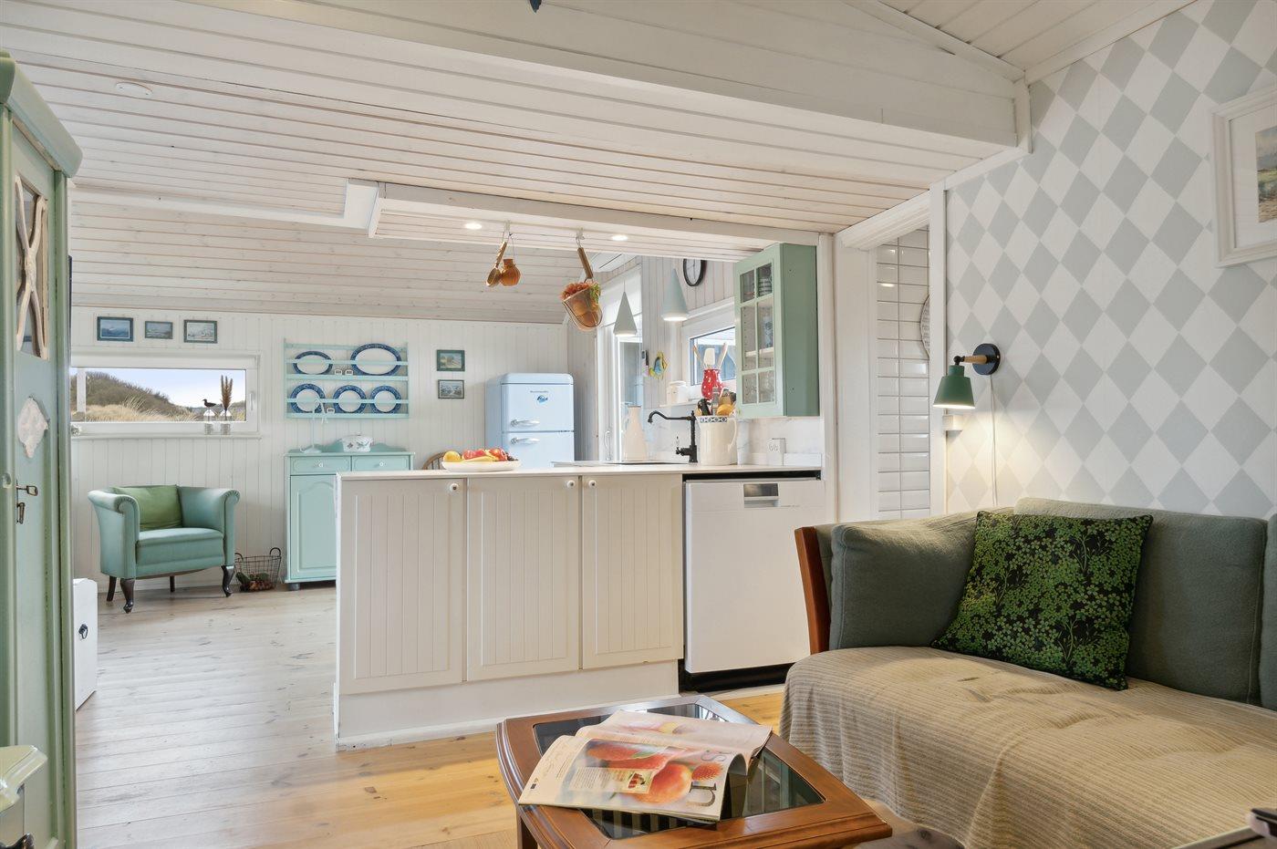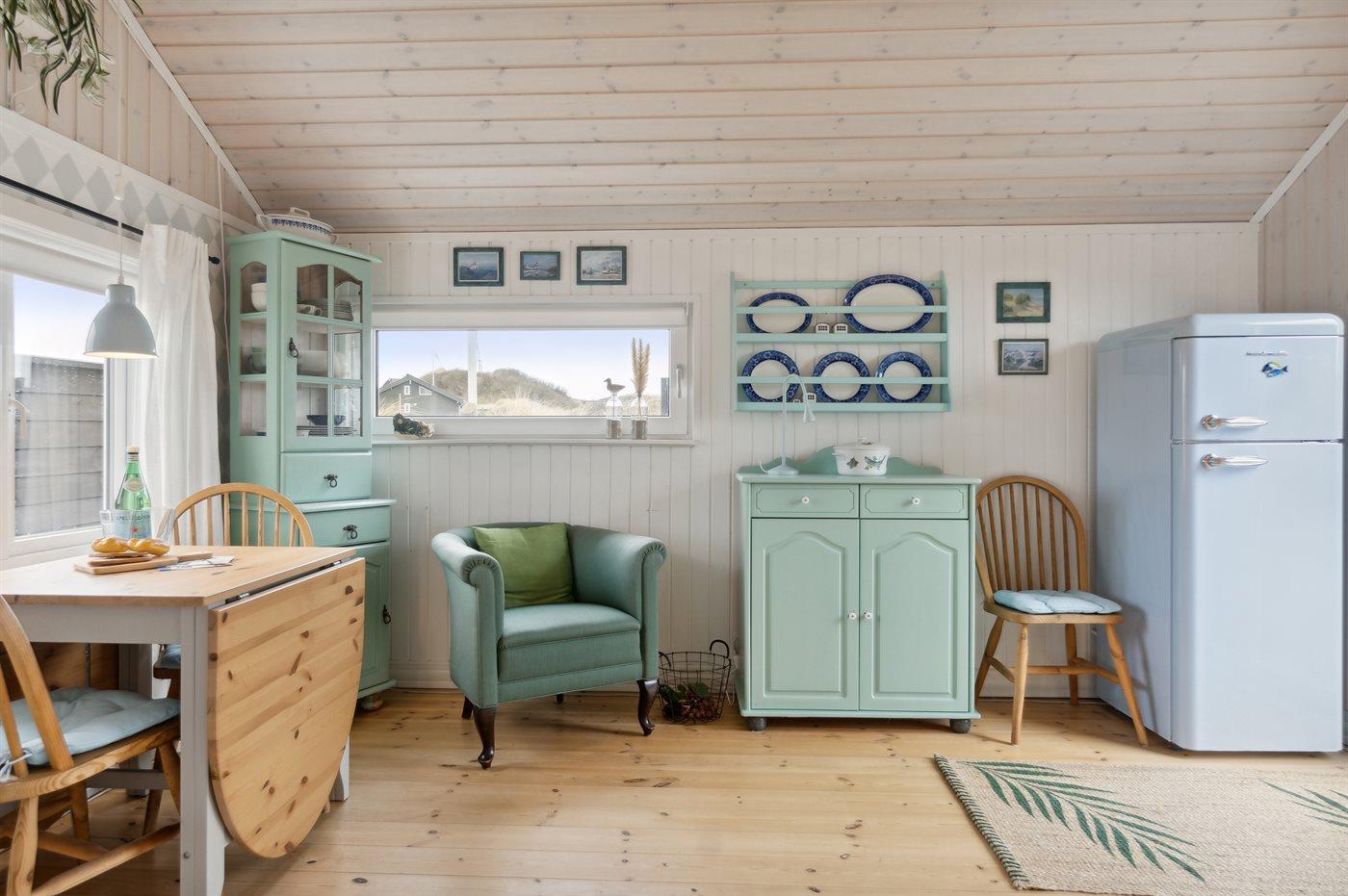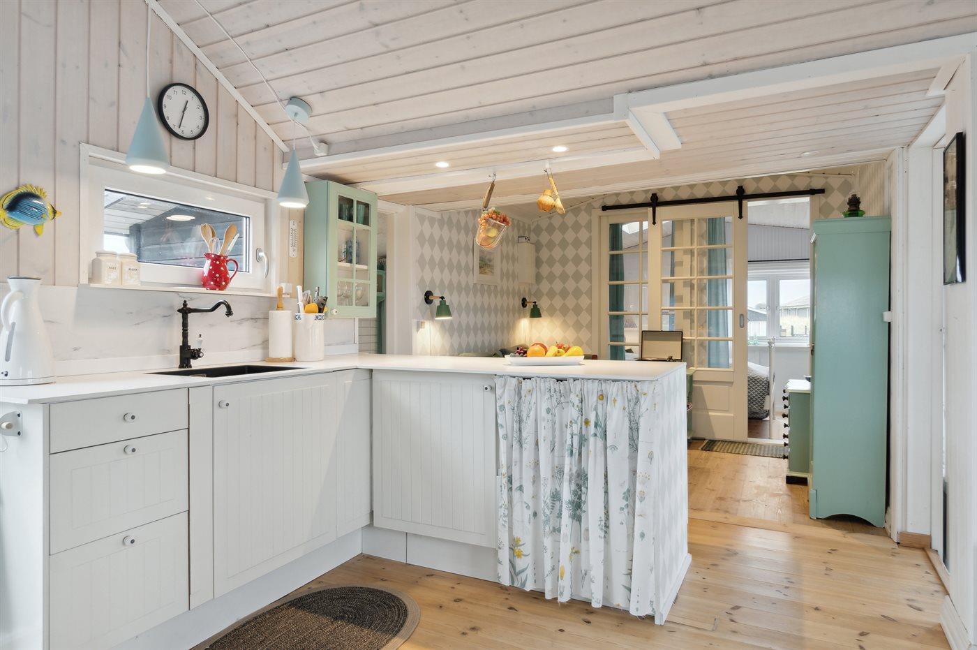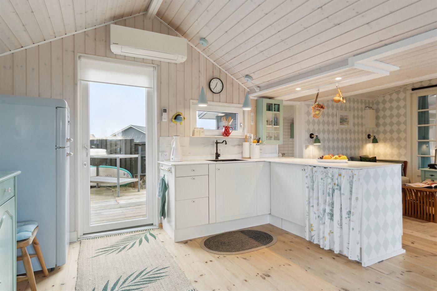 Køkkenet er udstyret med 1 køleskab. Der er 3 keramiske kogeplader, varmluftovn, kombineret miniovn/mikrobølgeovn samt opvaskemaskine.