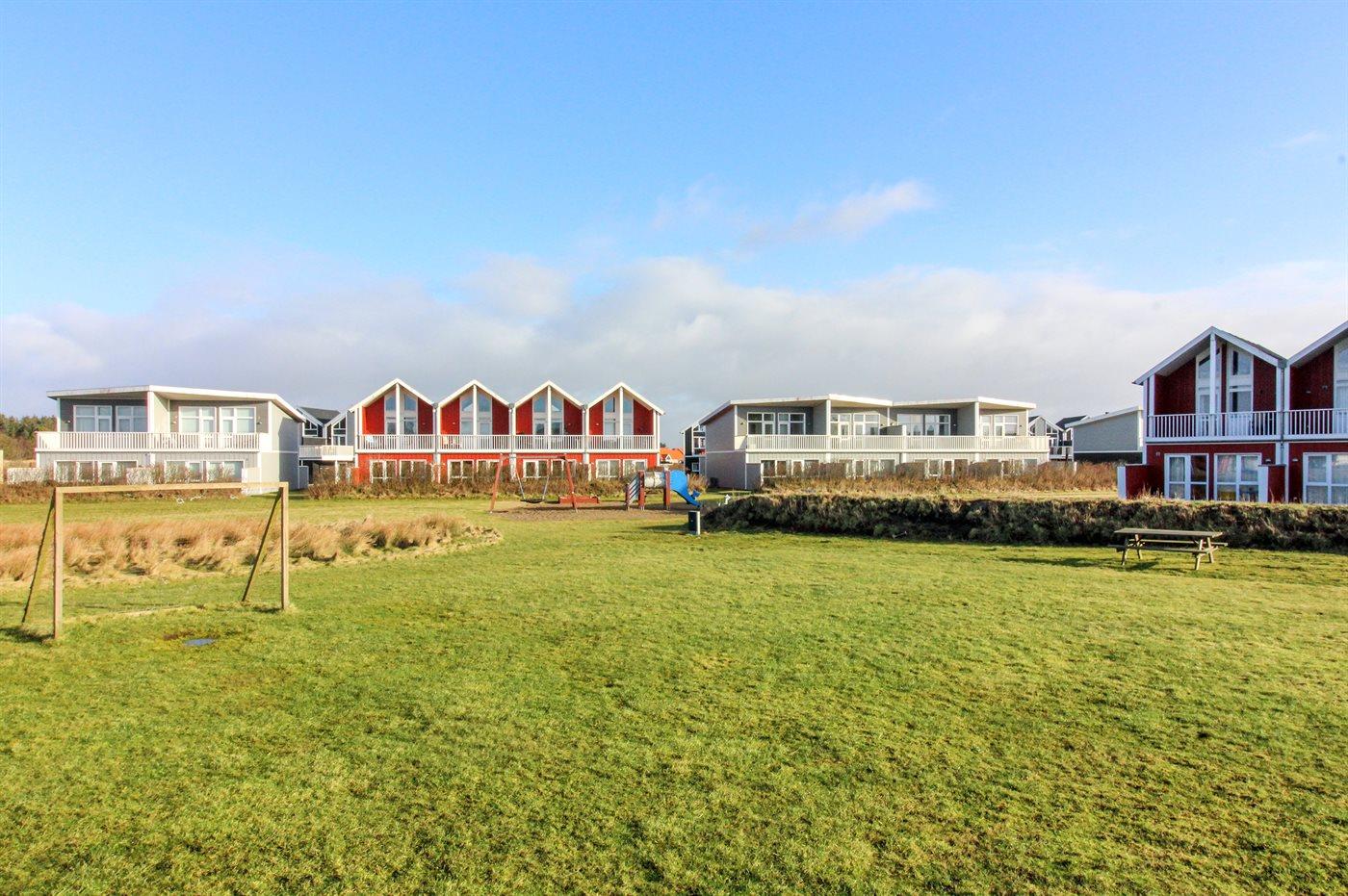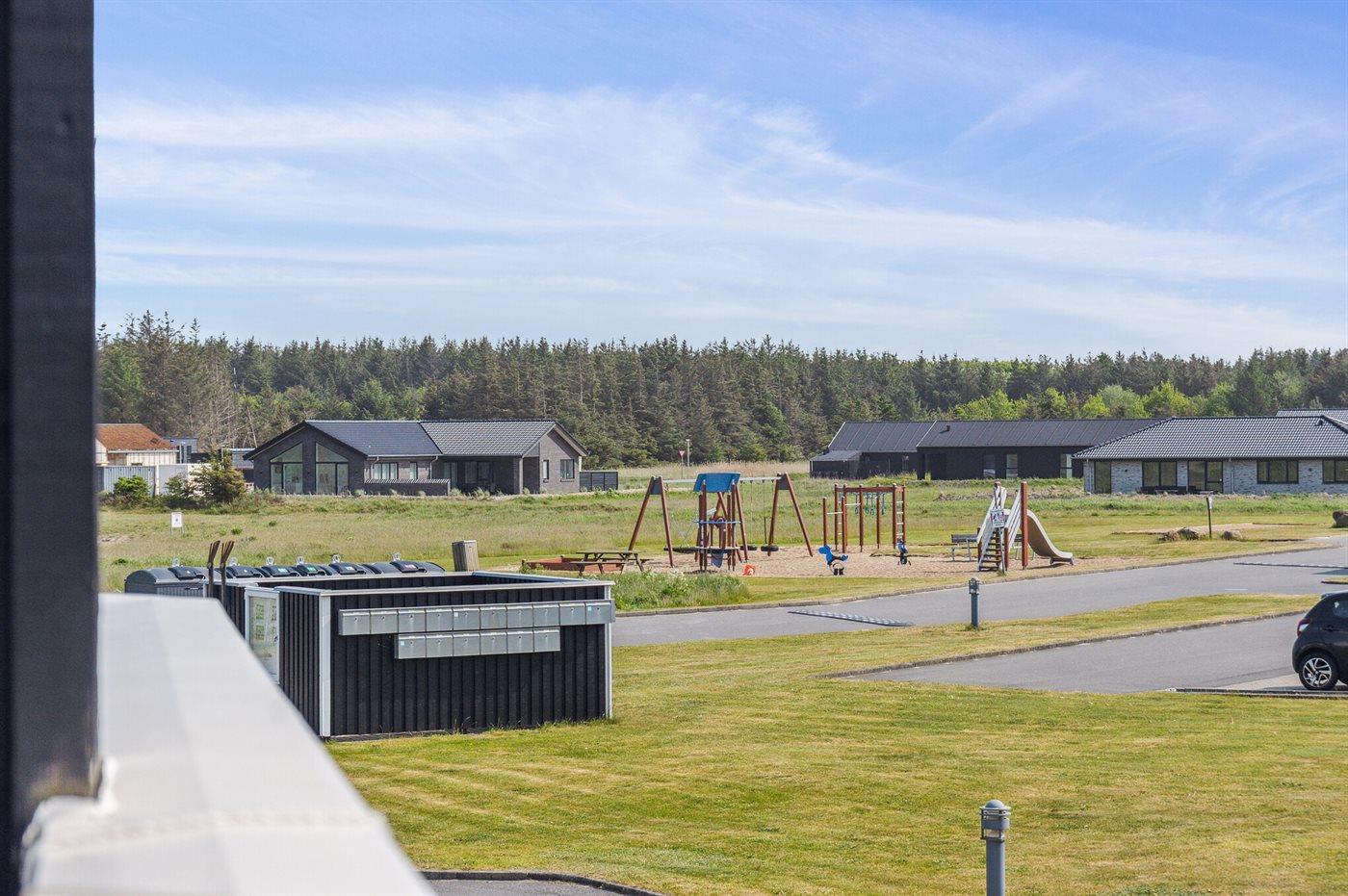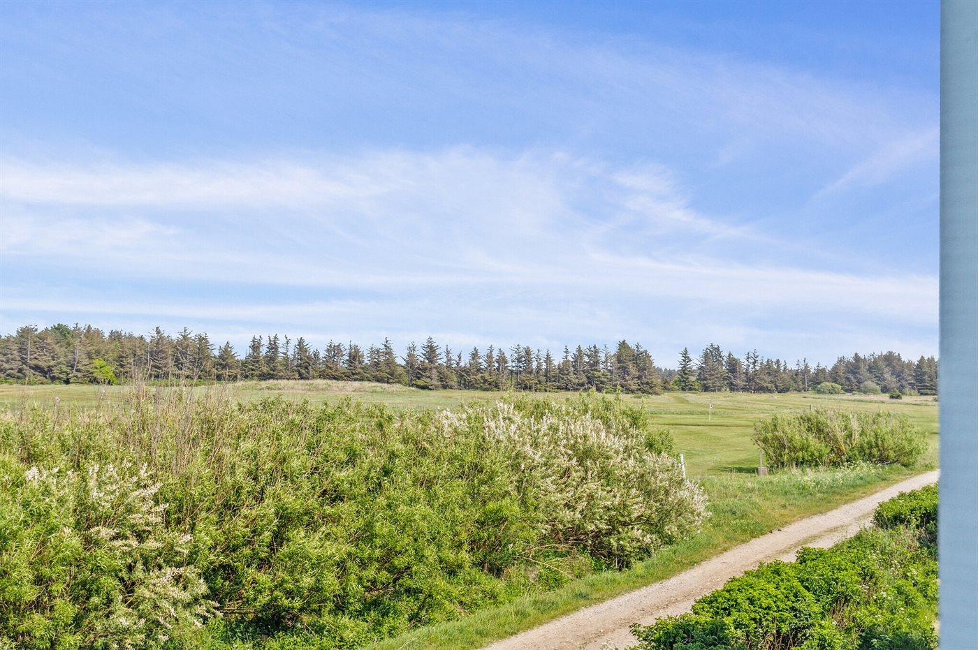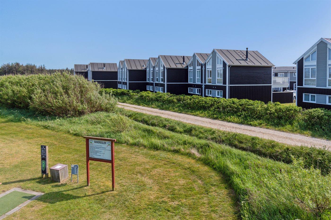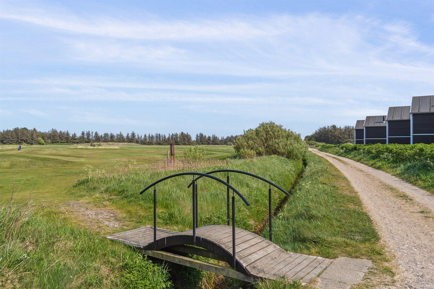 Ferieboligen er beliggende på en 120 m² stor naturgrund. Der er 700 m til havet. Nærmeste forretning er beliggende i en afstand af 700 m. Der er en golfbane i en afstand af 100 m. Til ferieboligen hører 11 m² terrasseareal. Desuden er der 11 m² overdækket terrasse. Udgang til altan. Gynge. Sandkasse. Der er installeret stik til opladning af elbil. Med 11 kW ladeeffekt. Parkering ved ferieboligen.