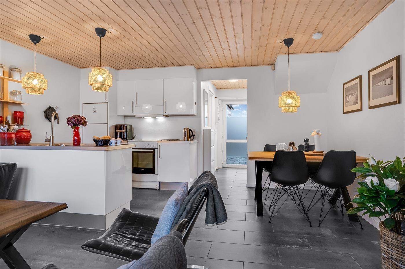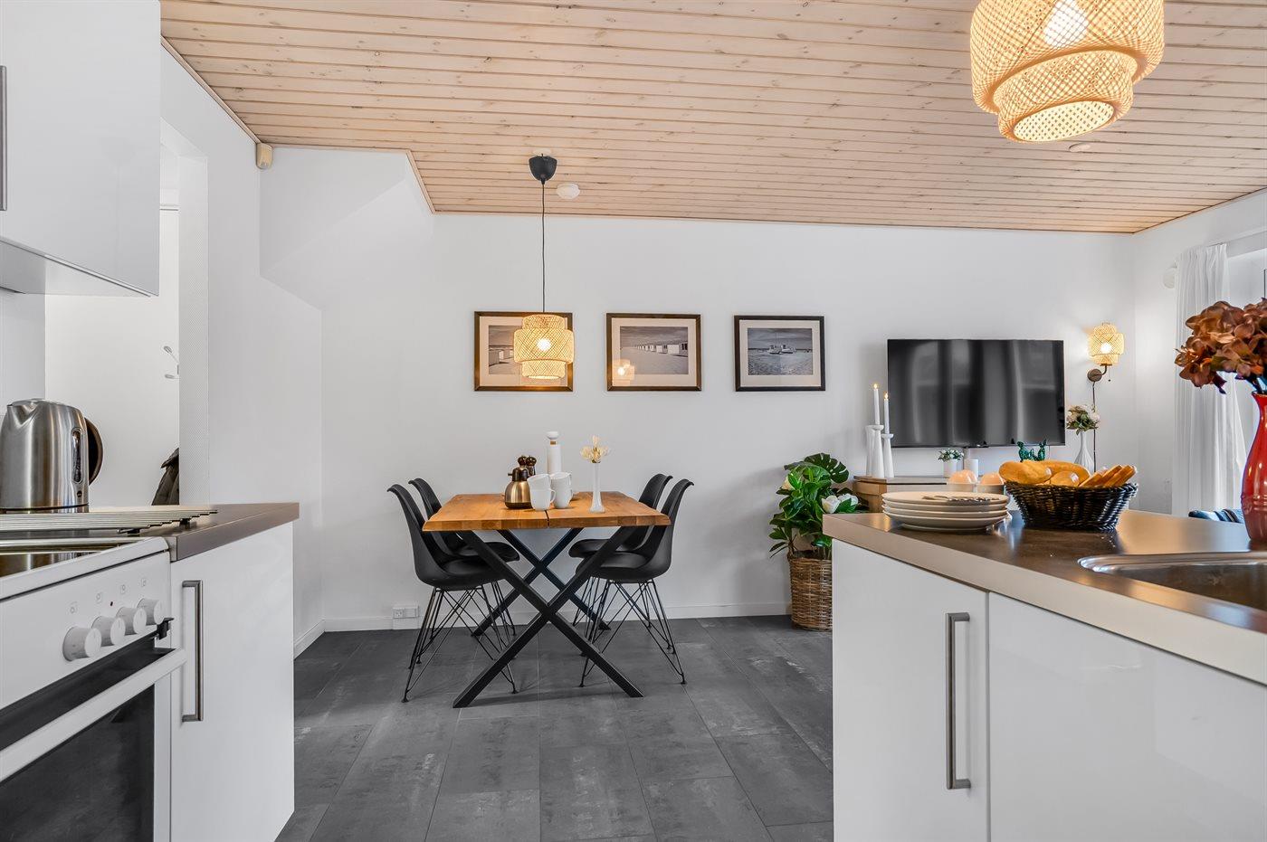 Køkkenet er udstyret med 1 køleskab. Der er 4 keramiske kogeplader, varmluftovn, mikrobølgeovn samt opvaskemaskine.