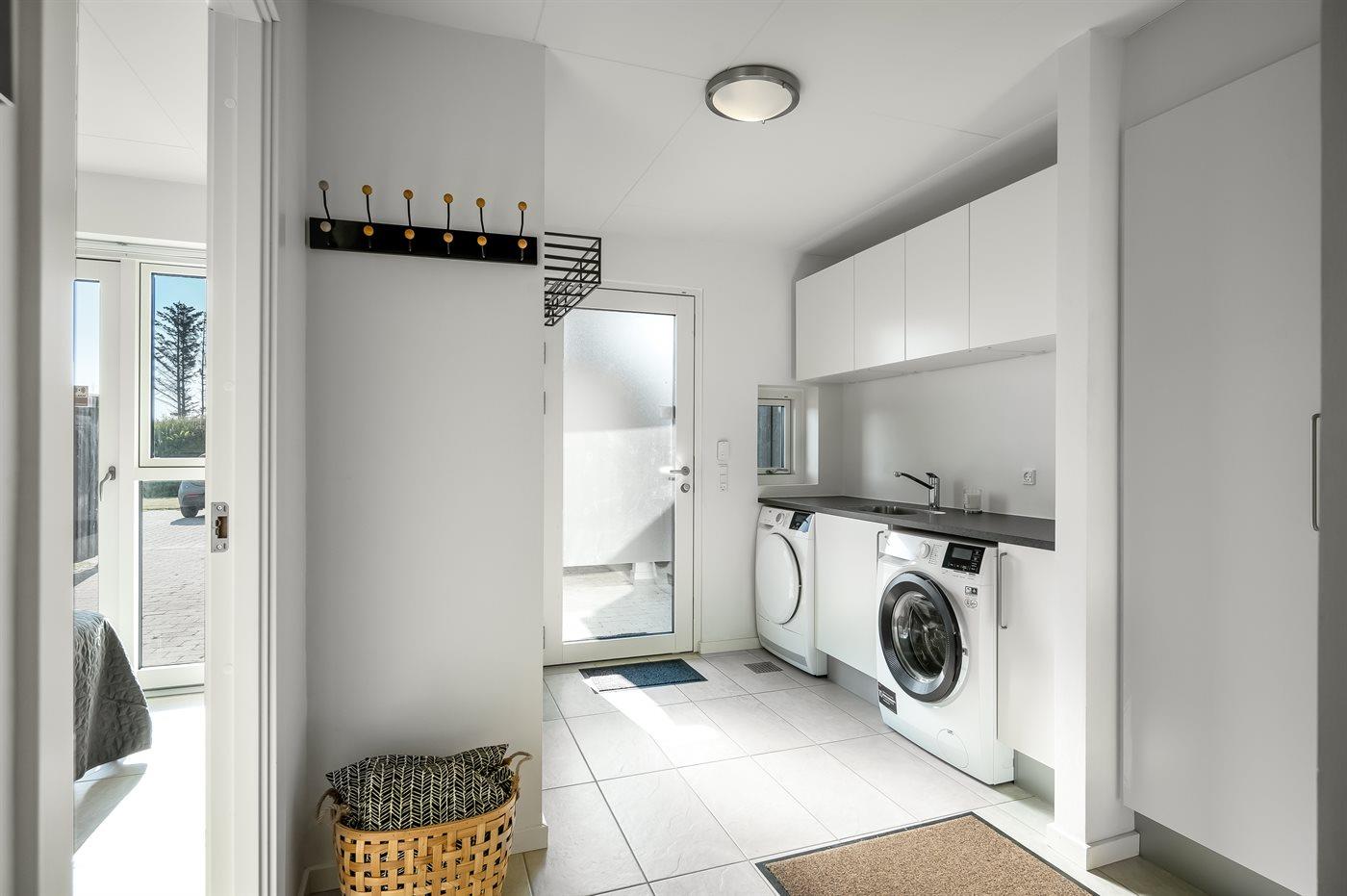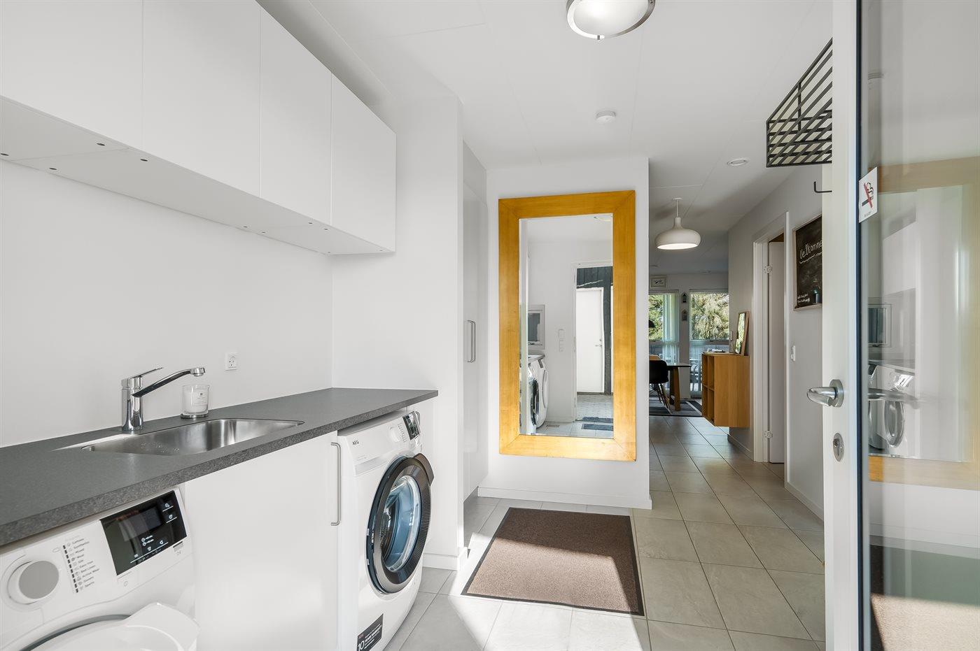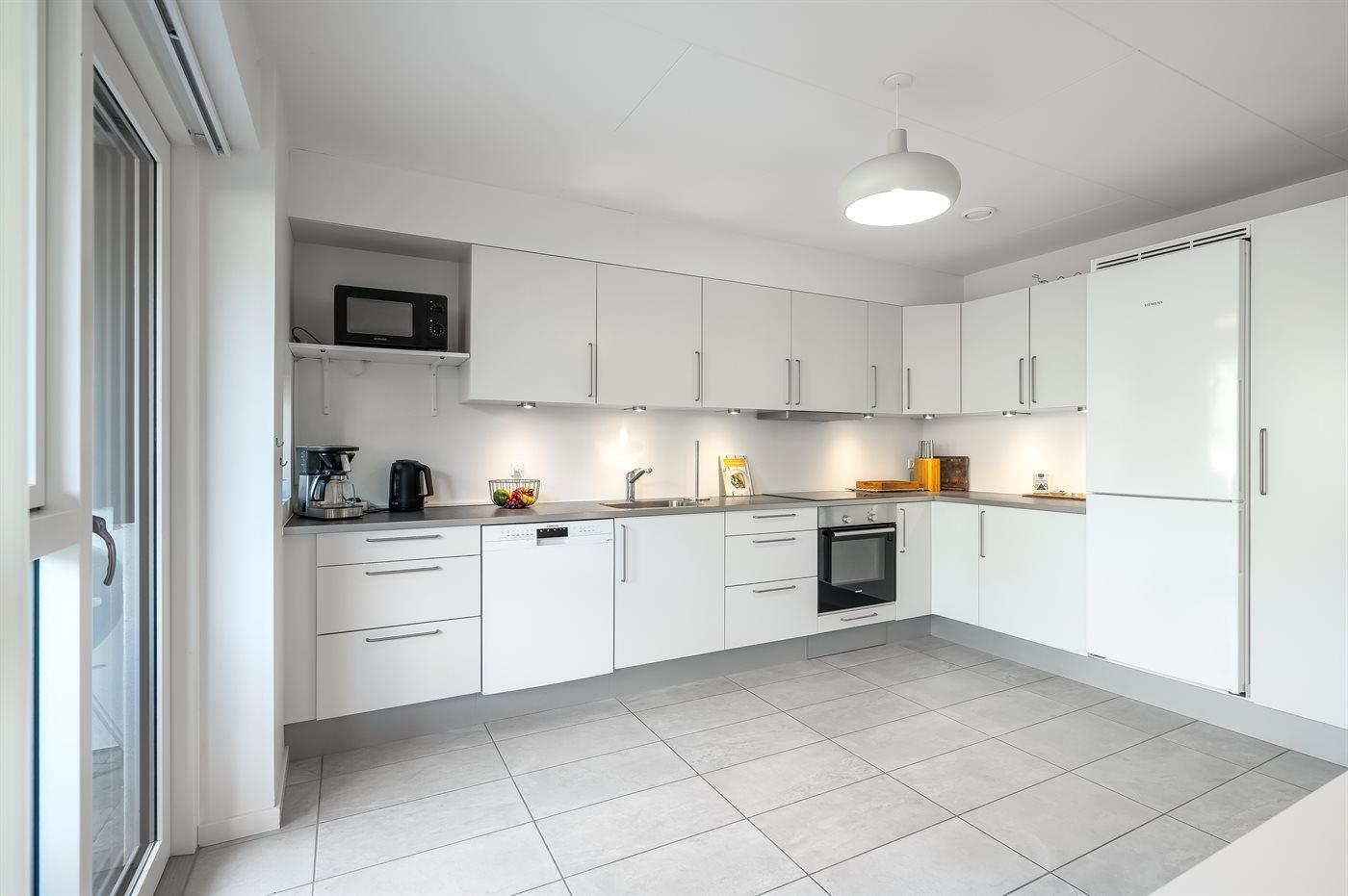 Køkkenet er udstyret med 1 køleskab. Der er 4 keramiske kogeplader, varmluftovn, mikrobølgeovn samt opvaskemaskine Der er gulvvarme i køkkenet.