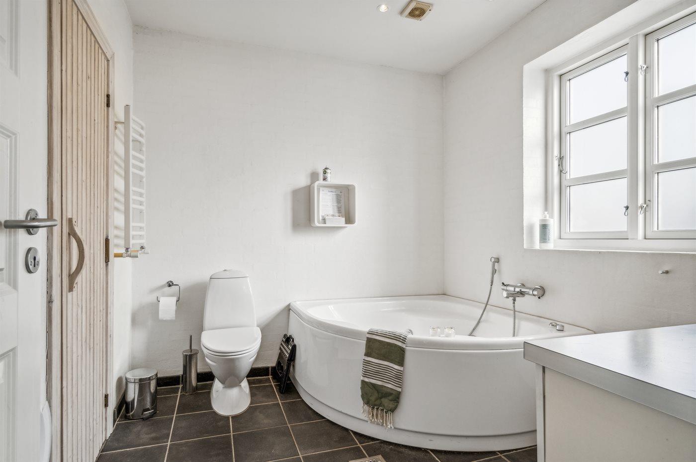 Der er 2 badeværelser med bruseniche og 2 toiletter. Der er gulvvarme på 2 badeværelser. I saunaen er der mulighed for afslapning.