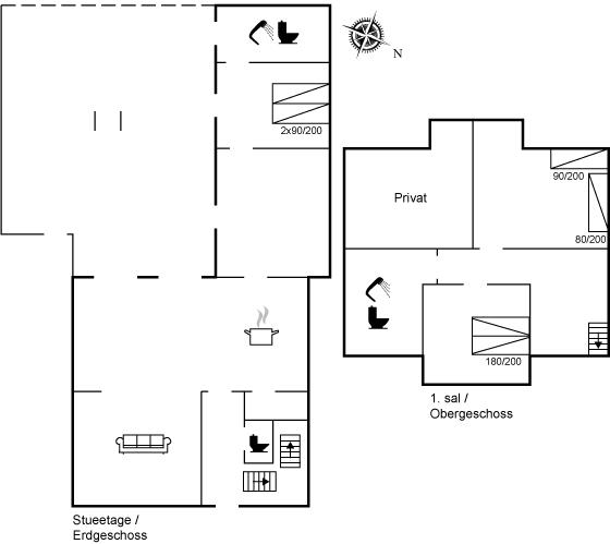 Der er i alt 3 soveværelser. Sovepladserne fordeler sig på: 4 sovepladser i dobbeltsenge. 2 sovepladser i enkeltsenge. Derudover er der 1 stk. barneseng.