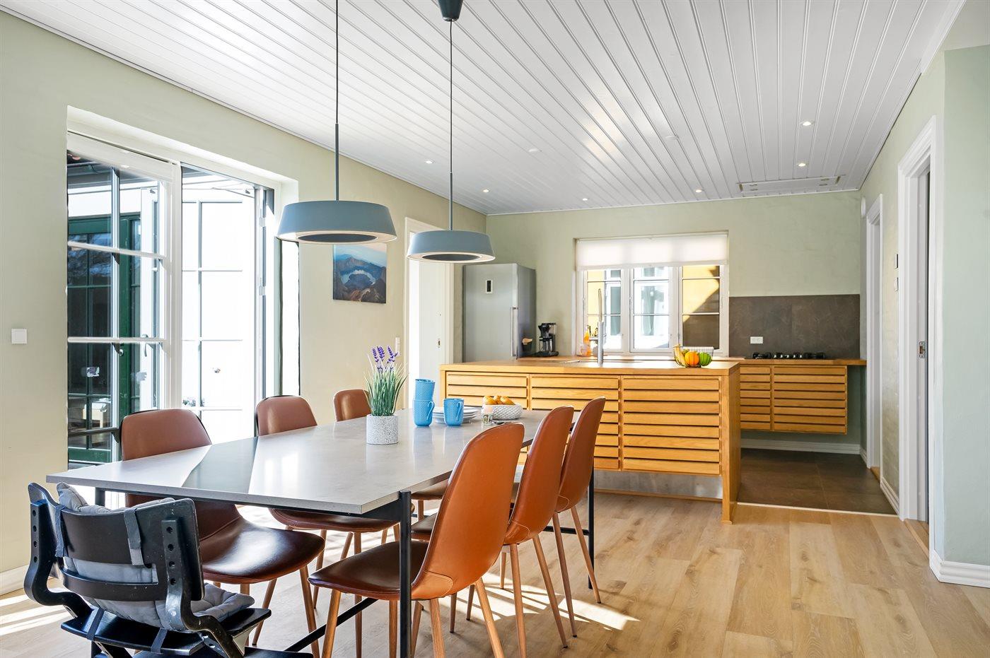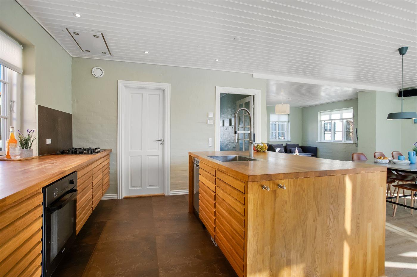 Køkkenet er udstyret med 1 køleskab. Der er 4 gasblus, varmluftovn, mikrobølgeovn samt opvaskemaskine Der er gulvvarme i køkkenet.