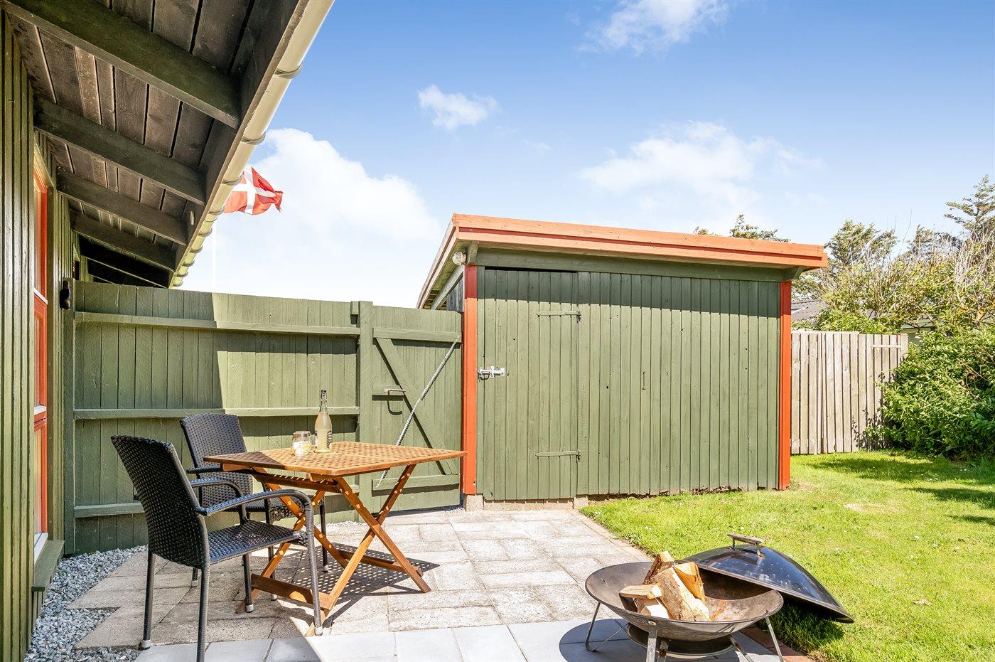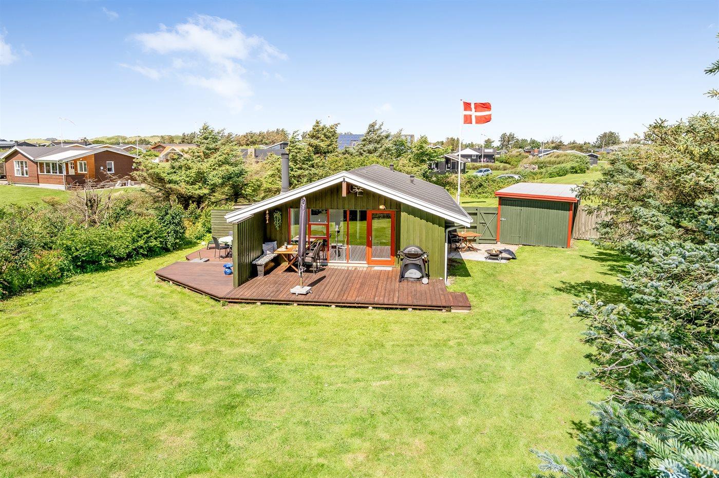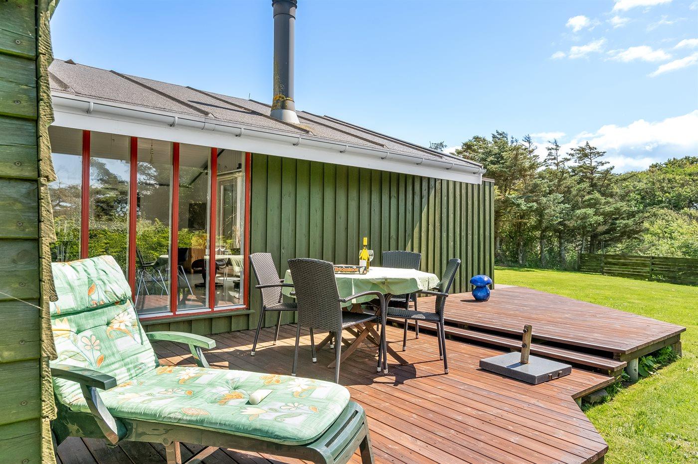 Ferieboligen er beliggende på en 1500 m² stor naturgrund. Grunden er indhegnet. Der er 600 m til havet. Nærmeste forretning er beliggende i en afstand af 400 m. Til ferieboligen hører åbent terrasseareal. Desuden er der overdækket terrasse. Der er redskabsrum. Grill til rådighed. Parkering ved ferieboligen.
