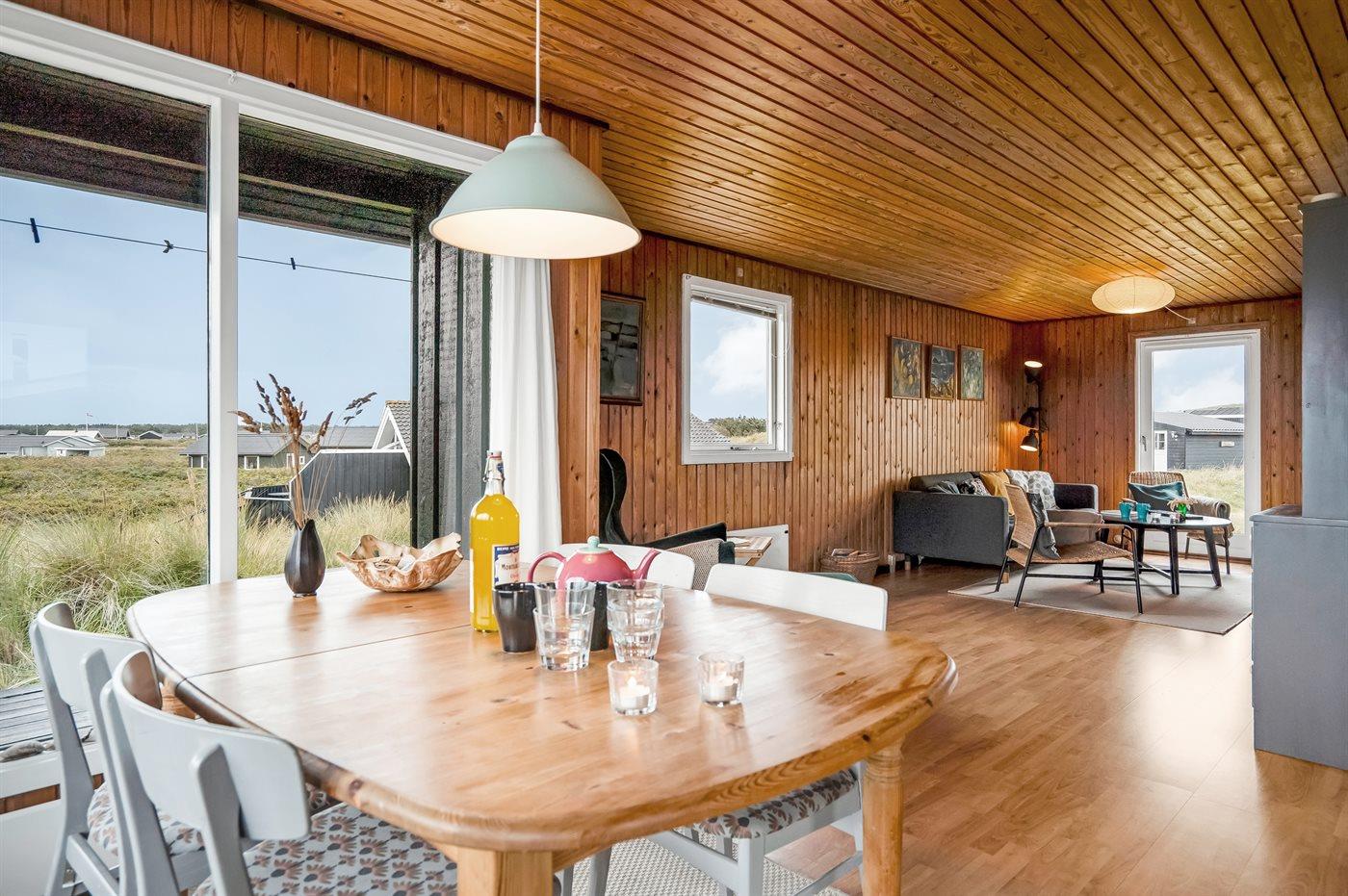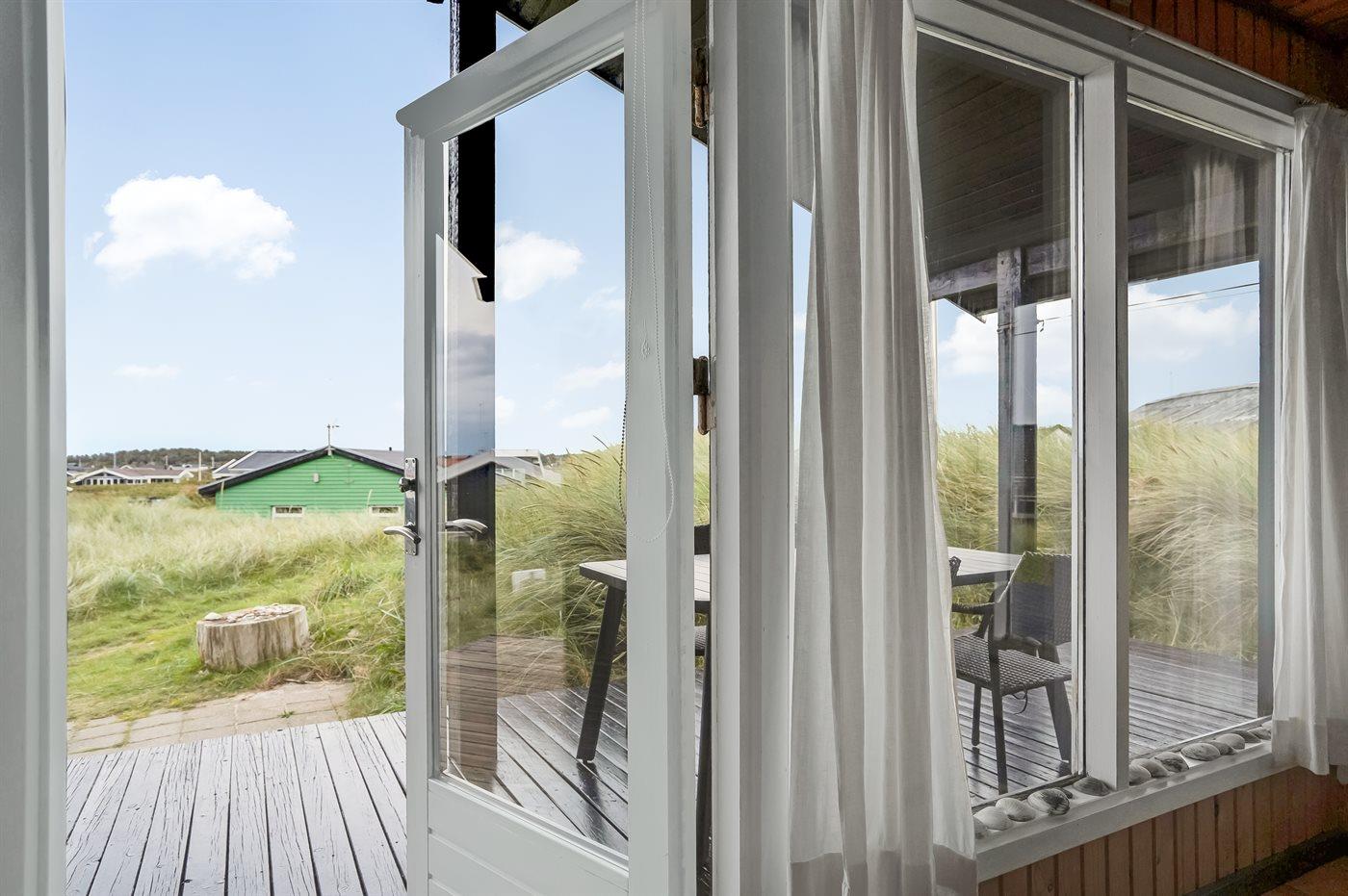 Til sommerhuset hører en stor træterrasse, som omgiver huset – her kan du nyde morgen-, middag- og aftensolen samt udsigten til den helt fantastiske solnedgang.