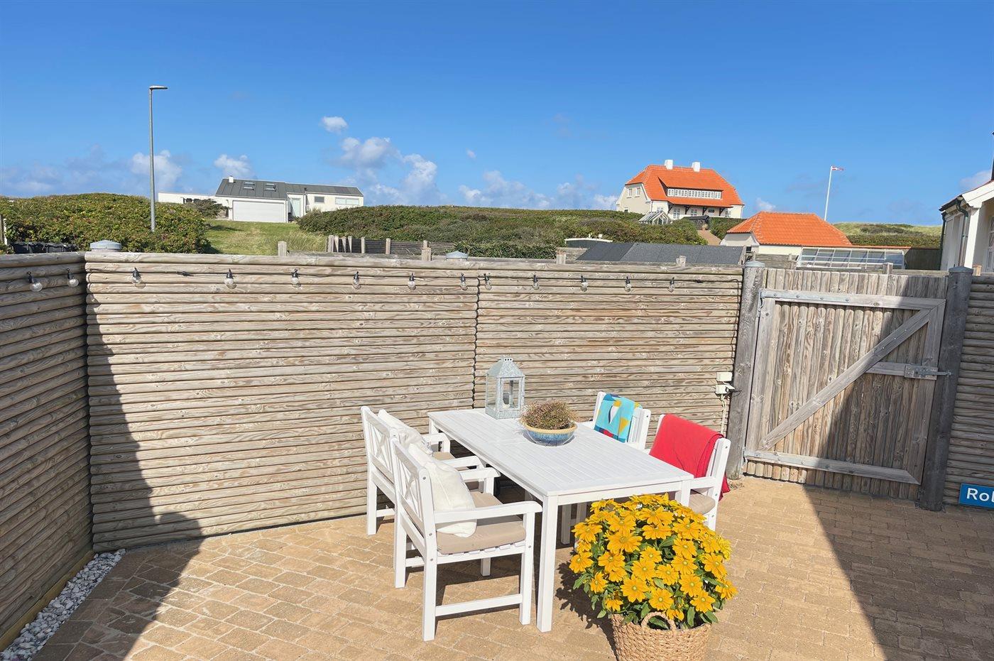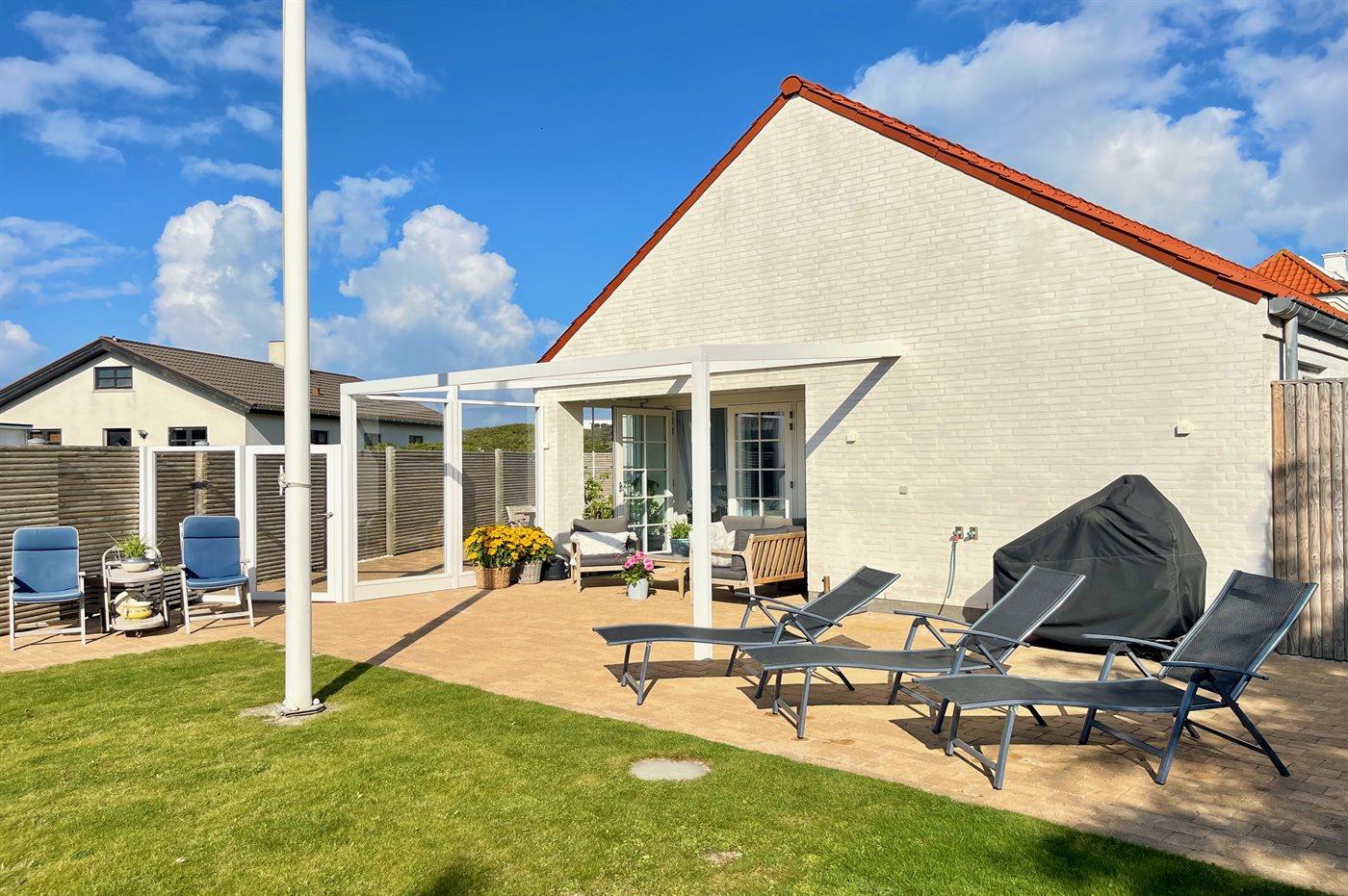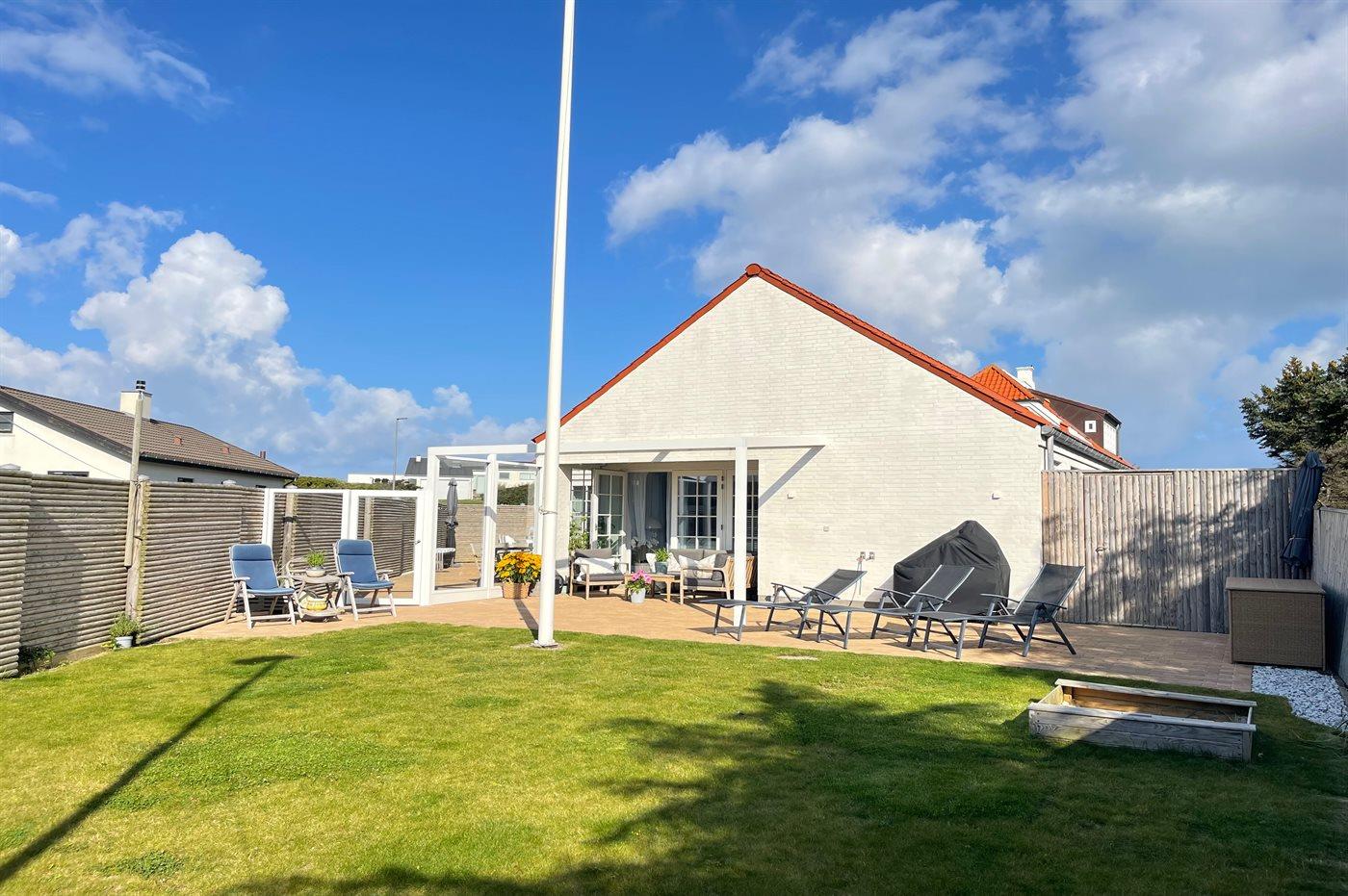 Ferieboligen er beliggende på en 600 m² stor havegrund. Grunden er indhegnet. Der er 110 m til havet. Nærmeste forretning er beliggende i en afstand af 500 m. Der er en golfbane i en afstand af 600 m. Til ferieboligen hører åbent terrasseareal. Desuden er der overdækket terrasse. Udendørs bruser. Grill til rådighed. Der er installeret stik til opladning af elbil. Type 2 stik. Parkering ved ferieboligen.