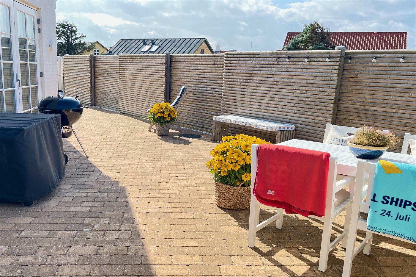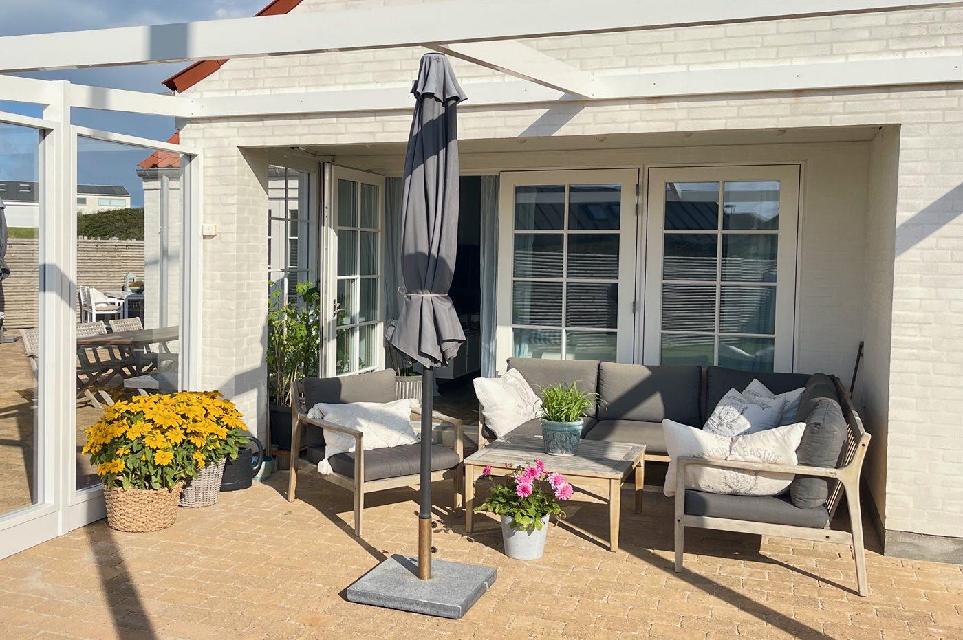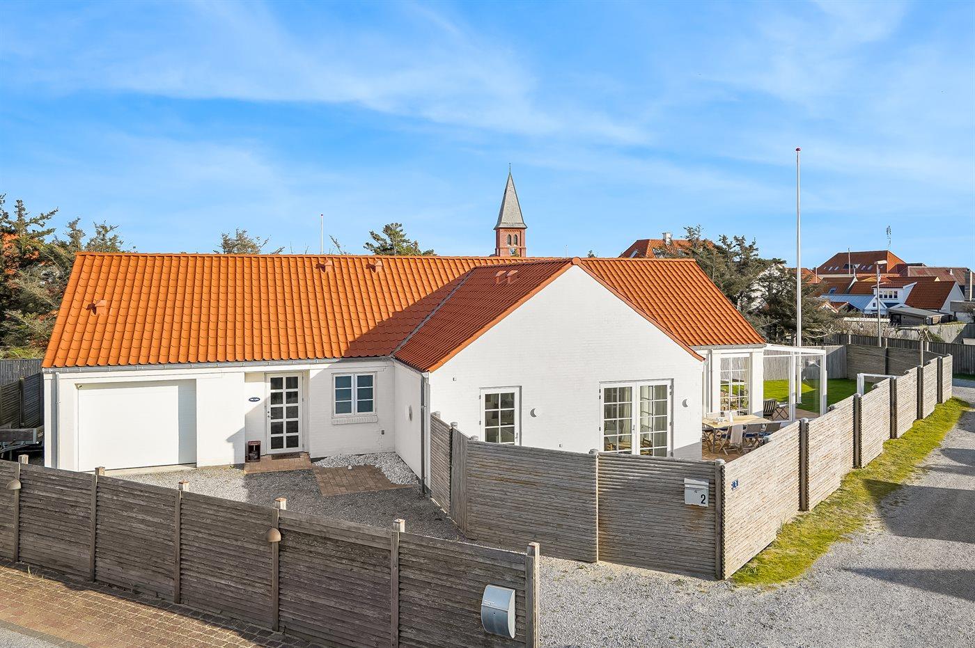 Ferieboligen er beliggende på en 600 m² stor havegrund. Grunden er indhegnet. Der er 110 m til havet. Nærmeste forretning er beliggende i en afstand af 500 m. Der er en golfbane i en afstand af 600 m. Til ferieboligen hører åbent terrasseareal. Desuden er der overdækket terrasse. Udendørs bruser. Grill til rådighed. Der er installeret stik til opladning af elbil. Type 2 stik. Parkering ved ferieboligen.