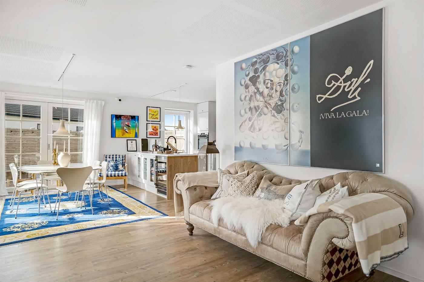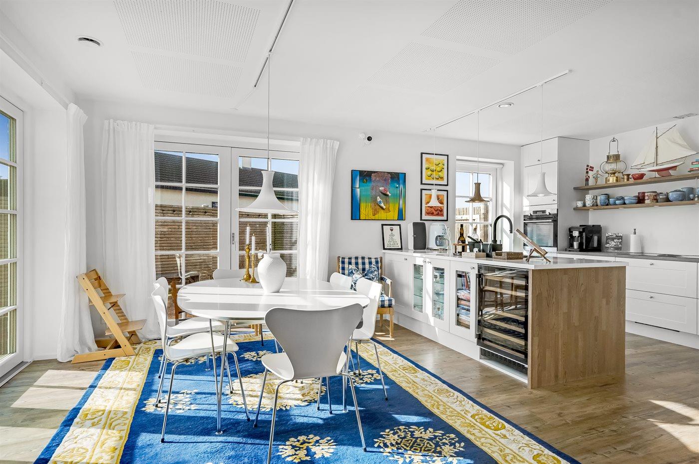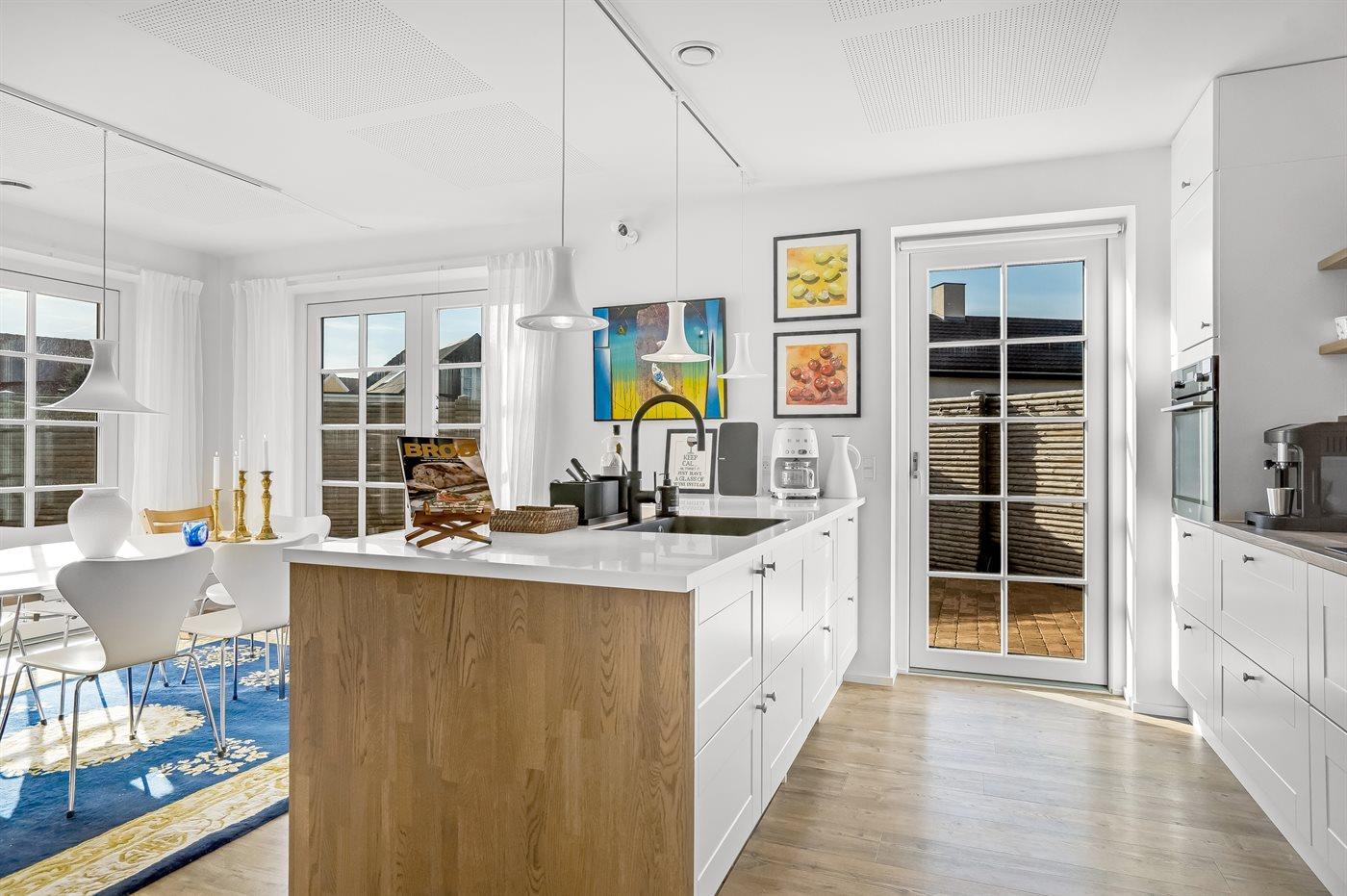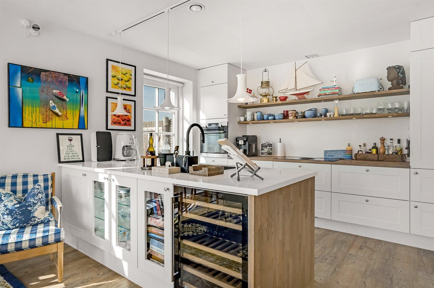 Køkkenet er udstyret med 2 køleskabe. Der er 4 induktionskogeplader, varmluftovn samt opvaskemaskine.