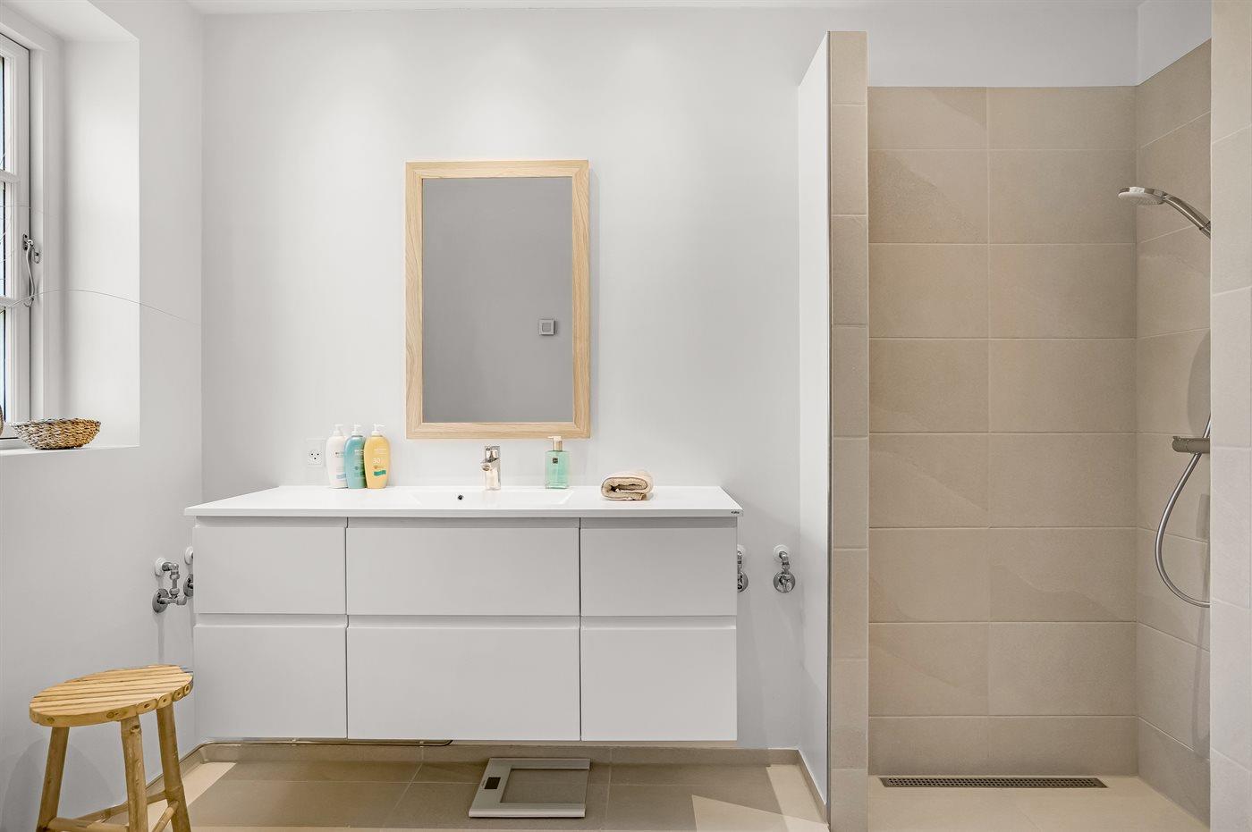 Der er 2 badeværelser med bruseniche og 2 toiletter. Der er gulvvarme på 2 badeværelser.