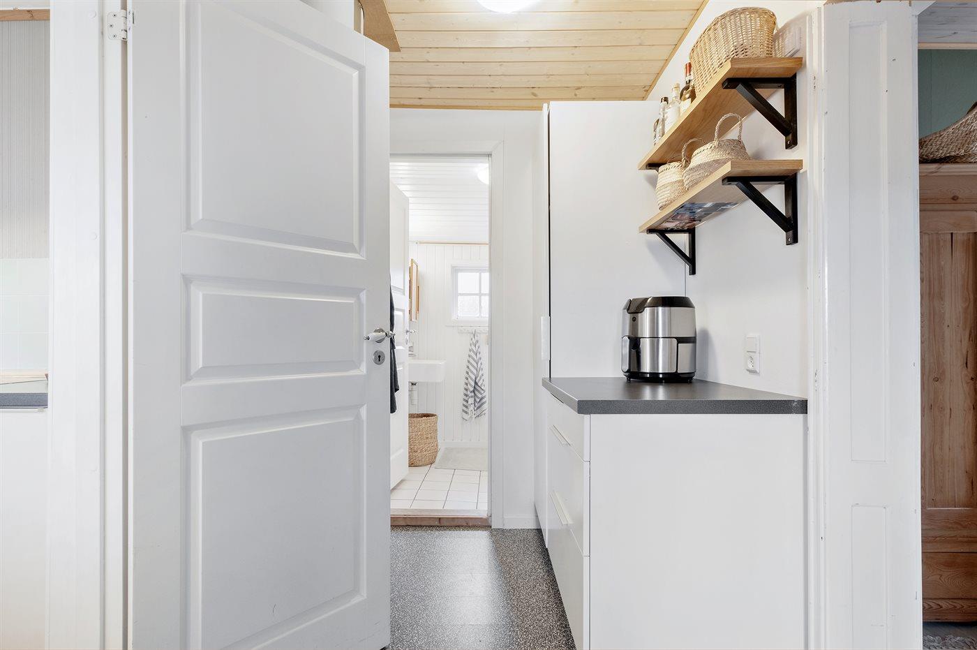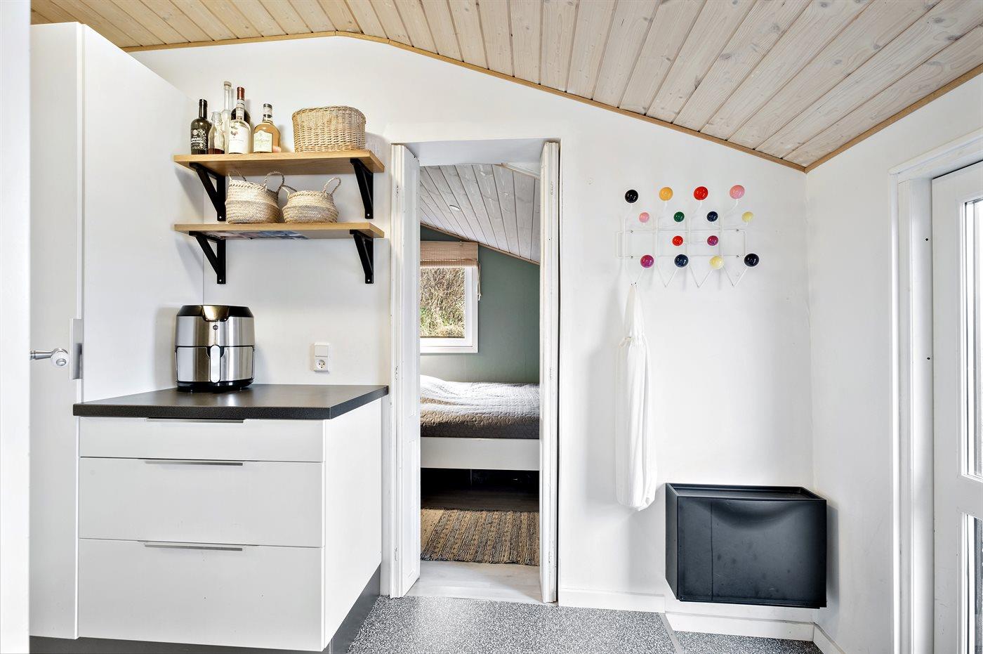 Køkkenet er udstyret med 1 køleskab. Der er 4 keramiske kogeplader, varmluftovn samt opvaskemaskine.
