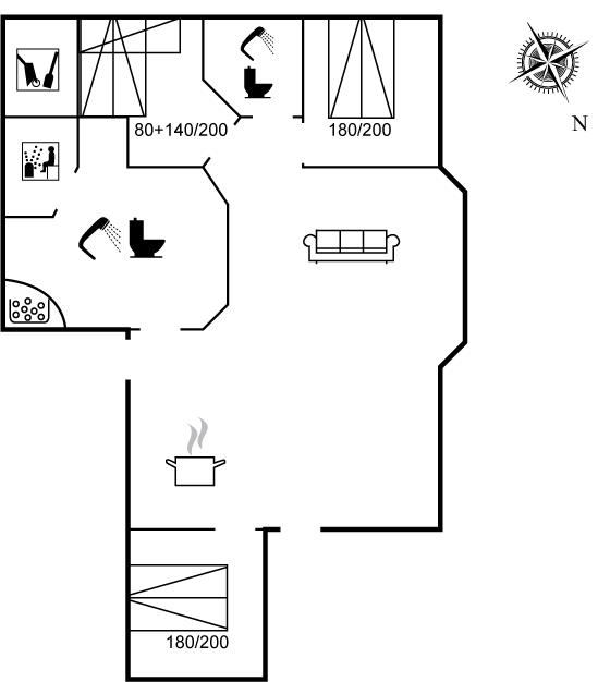 Der er 2 badeværelser med bruseniche og 2 toiletter. Der er gulvvarme på 2 badeværelser. I saunaen er der mulighed for afslapning.
