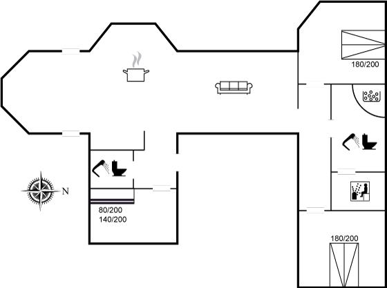 Køkkenet er udstyret med 1 køleskab. Der er 4 elkogeplader, varmluftovn, mikrobølgeovn samt opvaskemaskine.