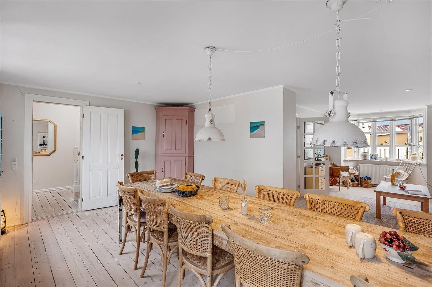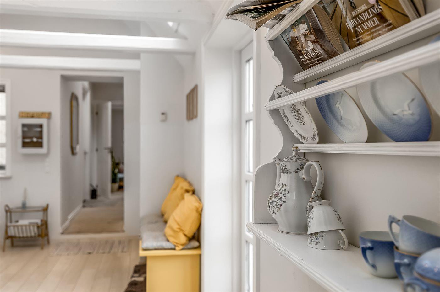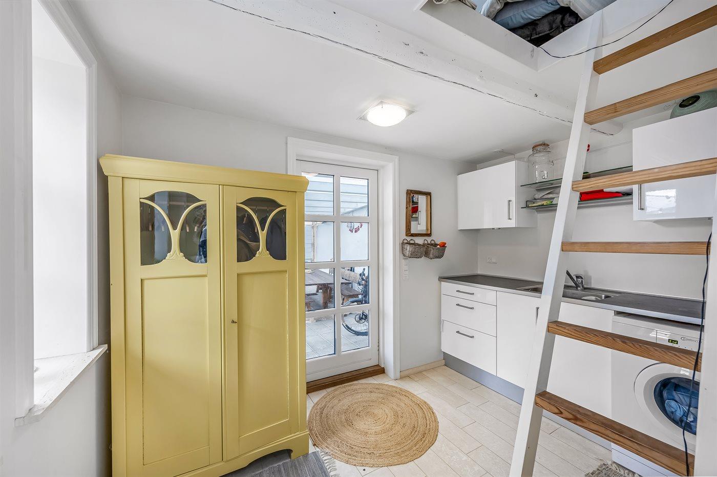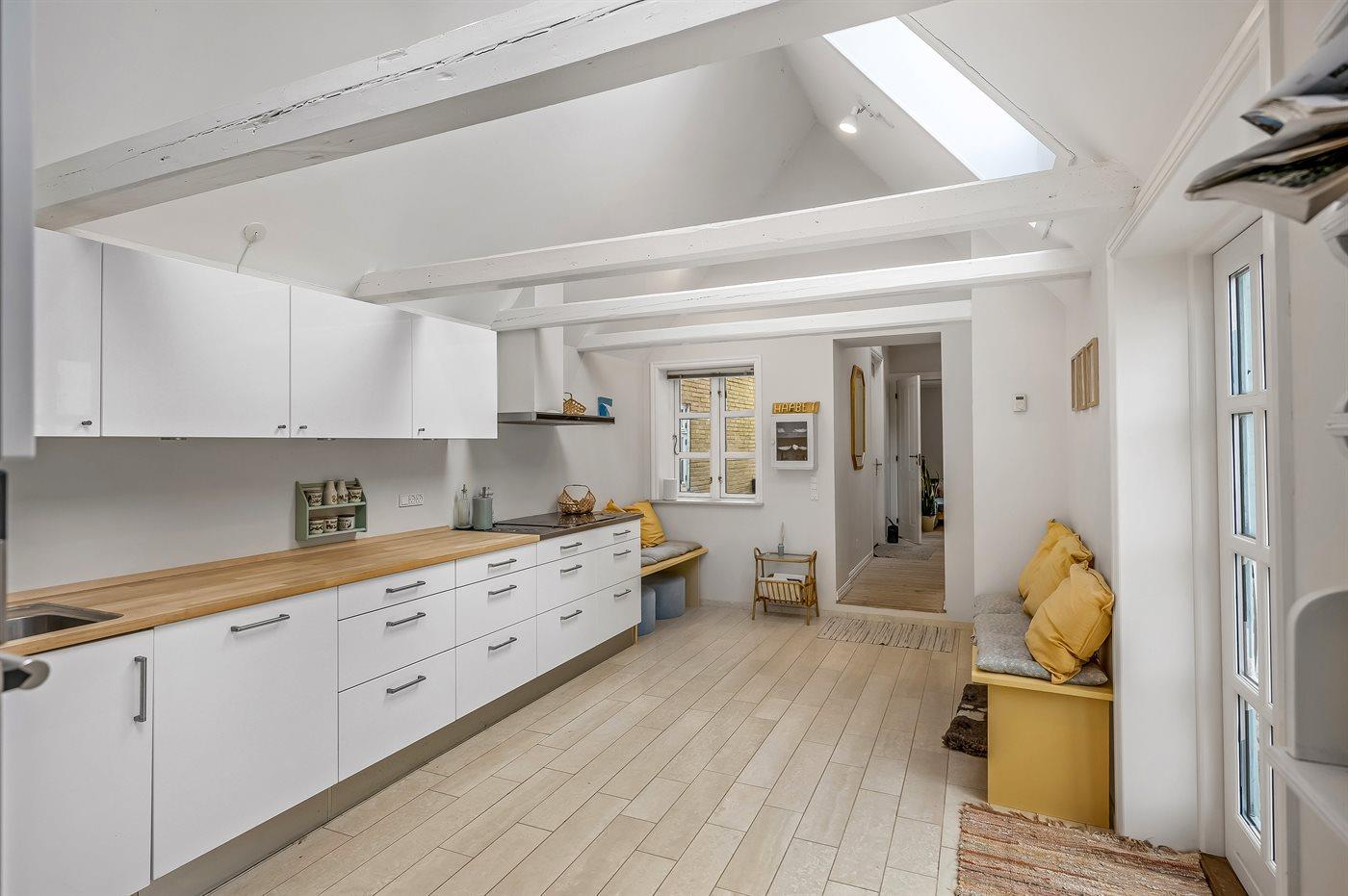 Køkkenet er udstyret med 1 køleskab. Der er 4 induktionskogeplader, varmluftovn, mikrobølgeovn samt opvaskemaskine Der er gulvvarme i køkkenet.