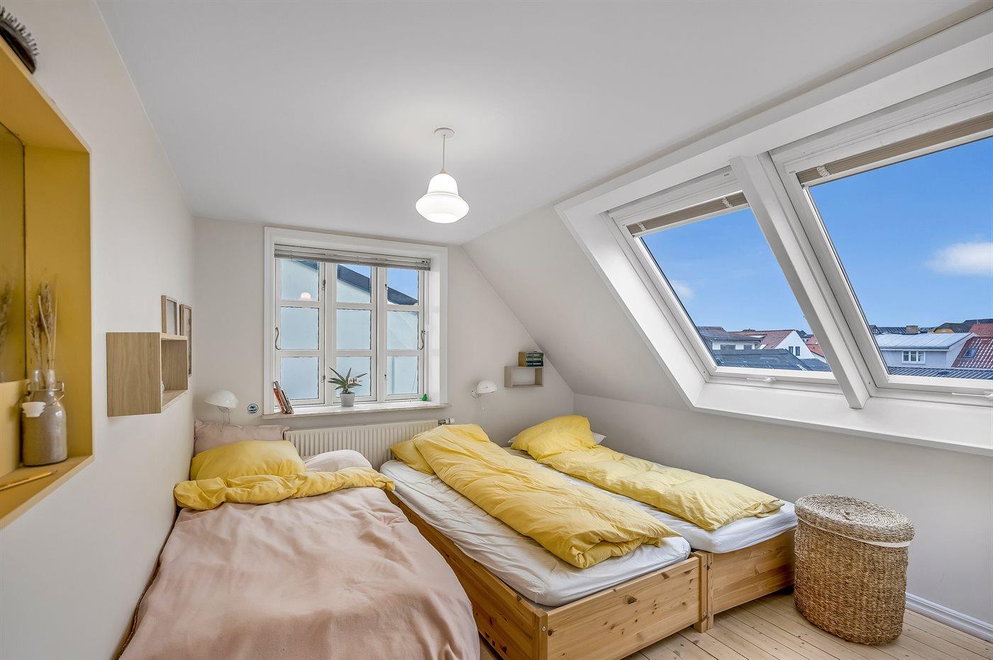 Der er i alt 3 soveværelser. Sovepladserne fordeler sig på: 2 sovepladser i dobbeltseng. 5 sovepladser i enkeltsenge.