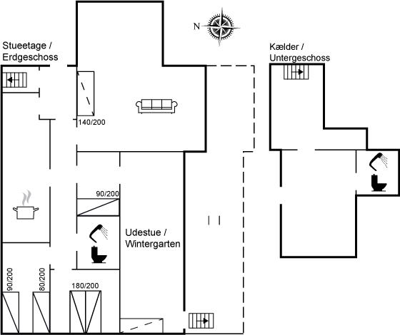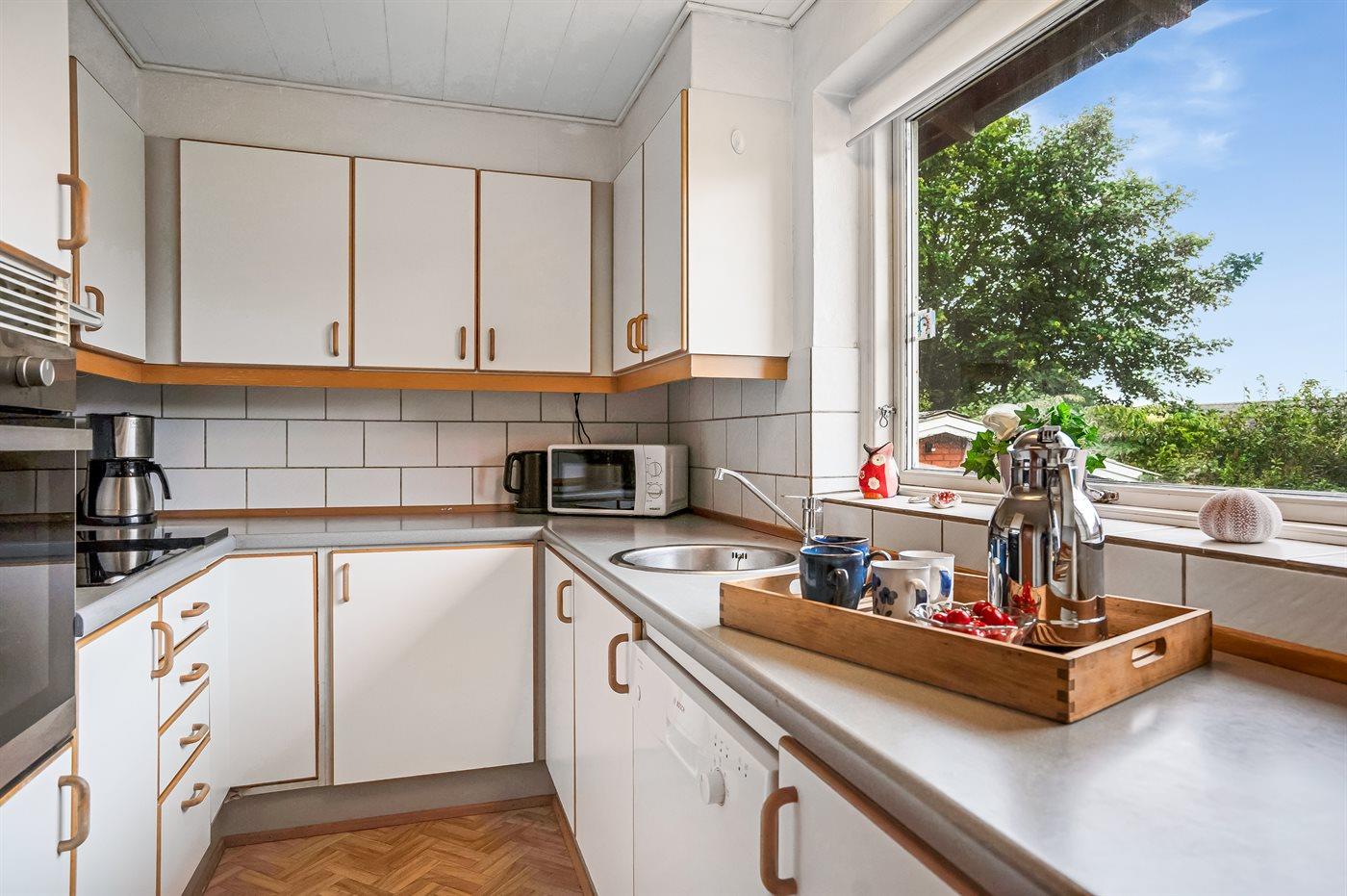 Køkkenet er udstyret med 1 køleskab, 4 keramiske kogeplader, varmluftovn, mikrobølgeovn samt opvaskemaskine. Der er 2 badeværelser med bruseniche og 2 toiletter. Det ene badeværelse er i kælderen.