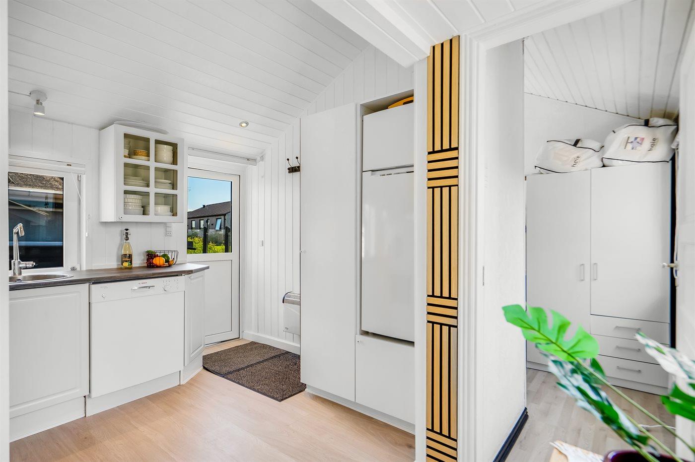 Køkkenet er udstyret med 1 køleskab. Der er 4 keramiske kogeplader, varmluftovn, mikrobølgeovn samt opvaskemaskine.