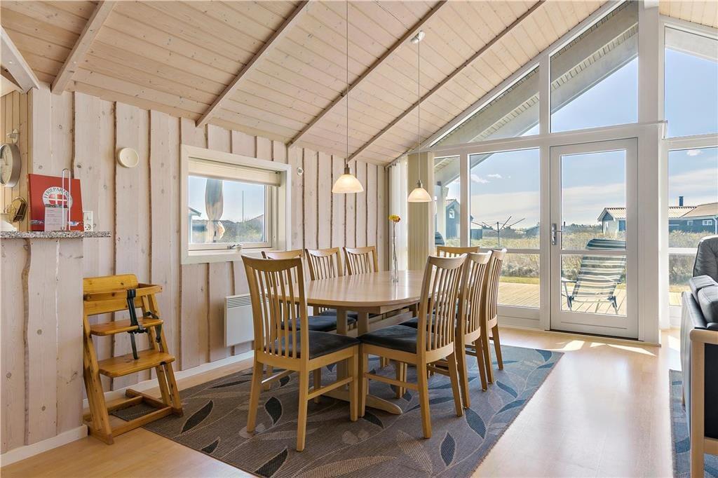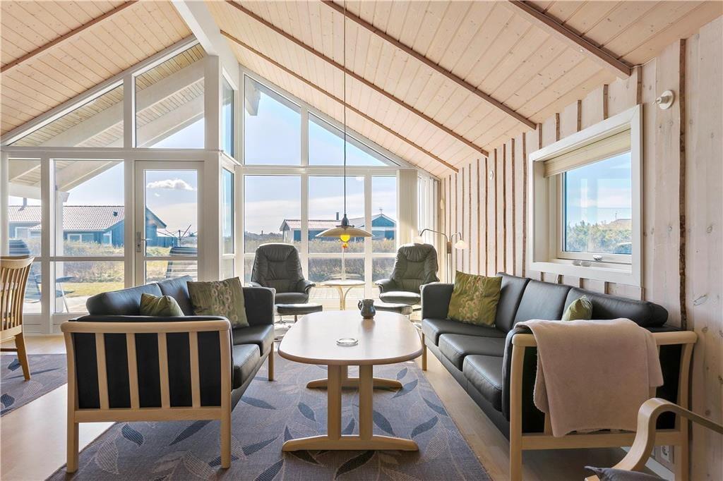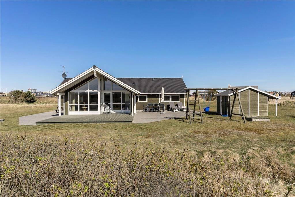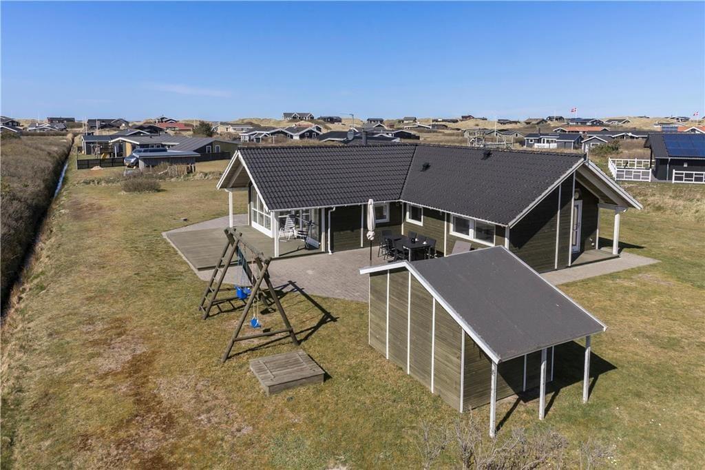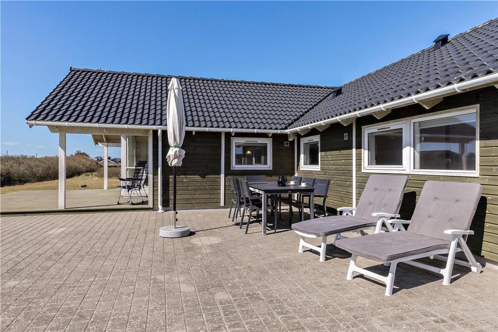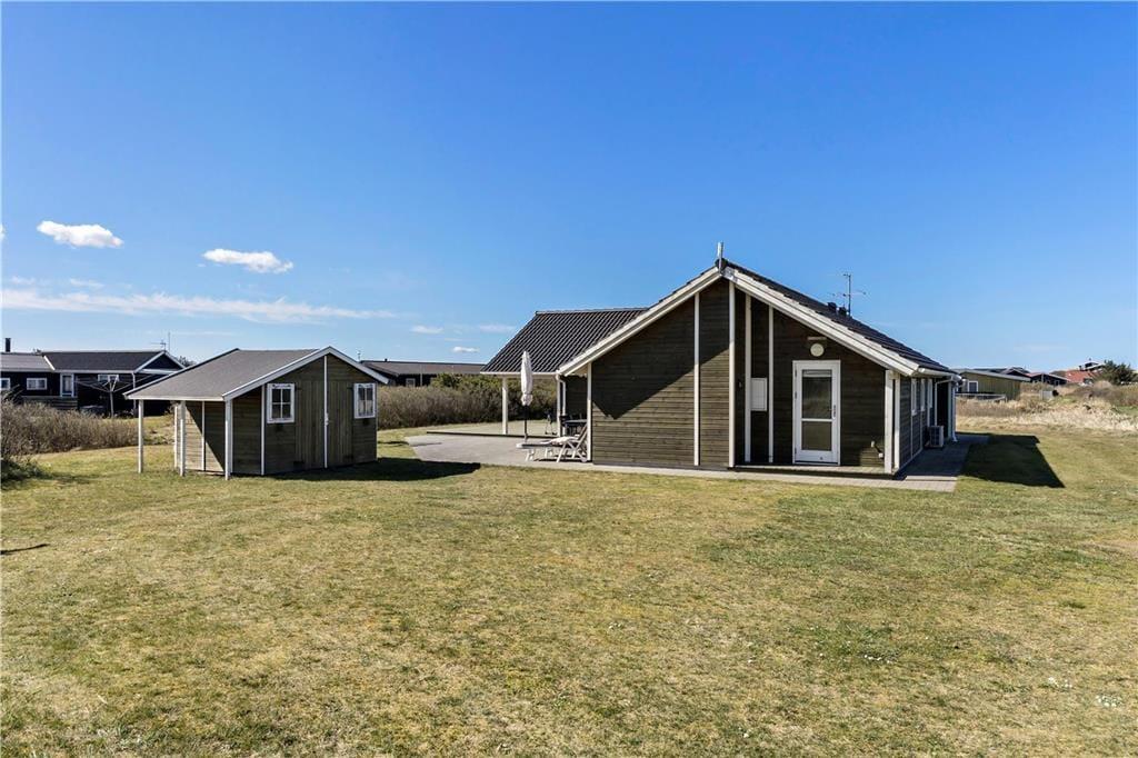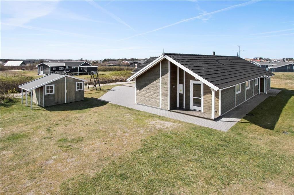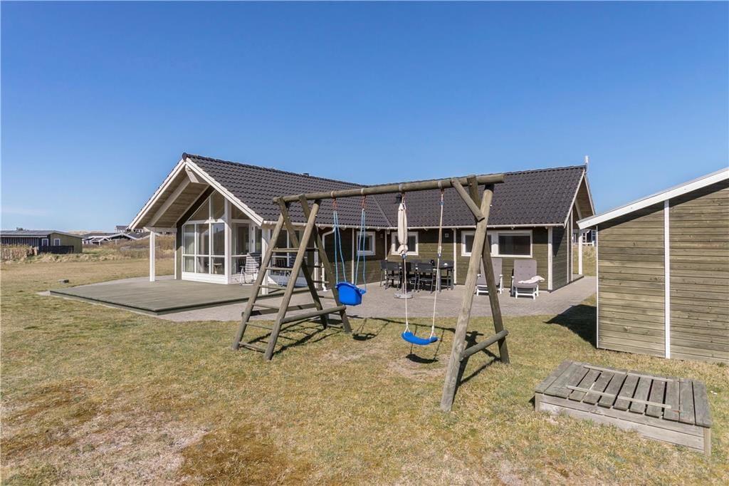Udendørs får I glæde af en stor plæne, som indbyder til både leg og afslapning. Her er plads til boldspil og masser af sjove timer for de yngste, som kan hygge sig med gynger og sandkasse. Den rummelige terrasse omkranser huset og er indrettet med både overdækket og åben plads, så der er mulighed for at finde læ eller skygge i løbet af dagen. På den overdækkede terrasse kan I nyde morgenkaffen, mens I hører Vesterhavets bølger i baggrunden – en perfekt start på dagen. Huset ligger for enden af en rolig stikvej, så her kan I virkelig slappe af uden forstyrrelser.