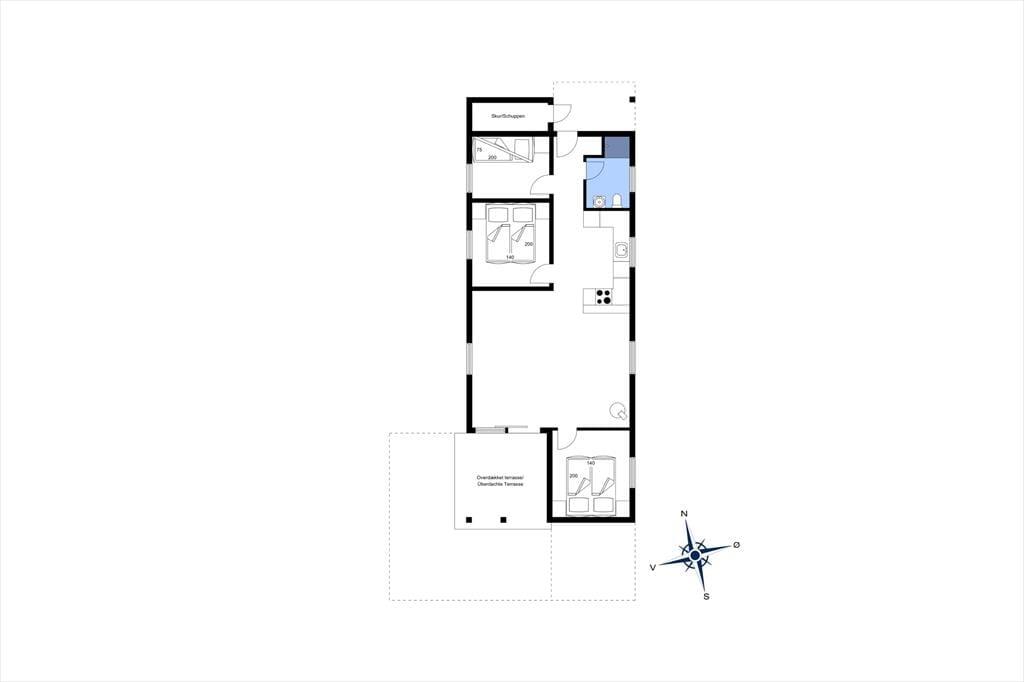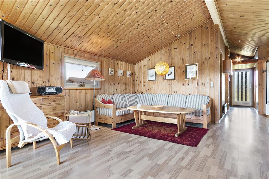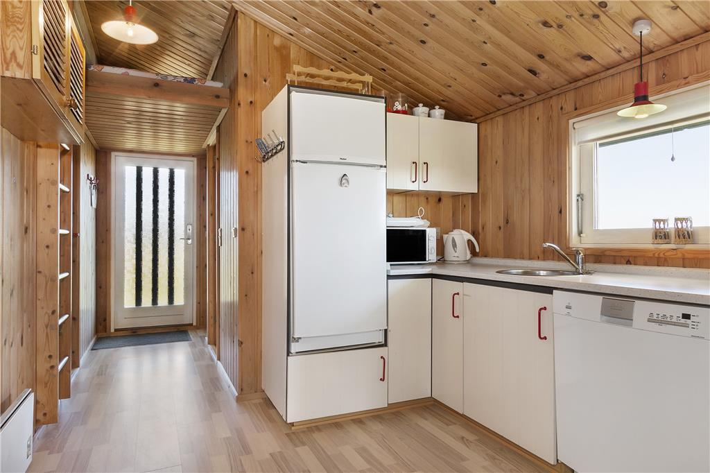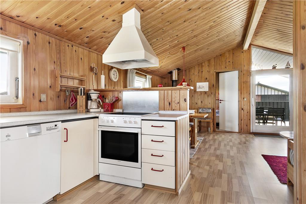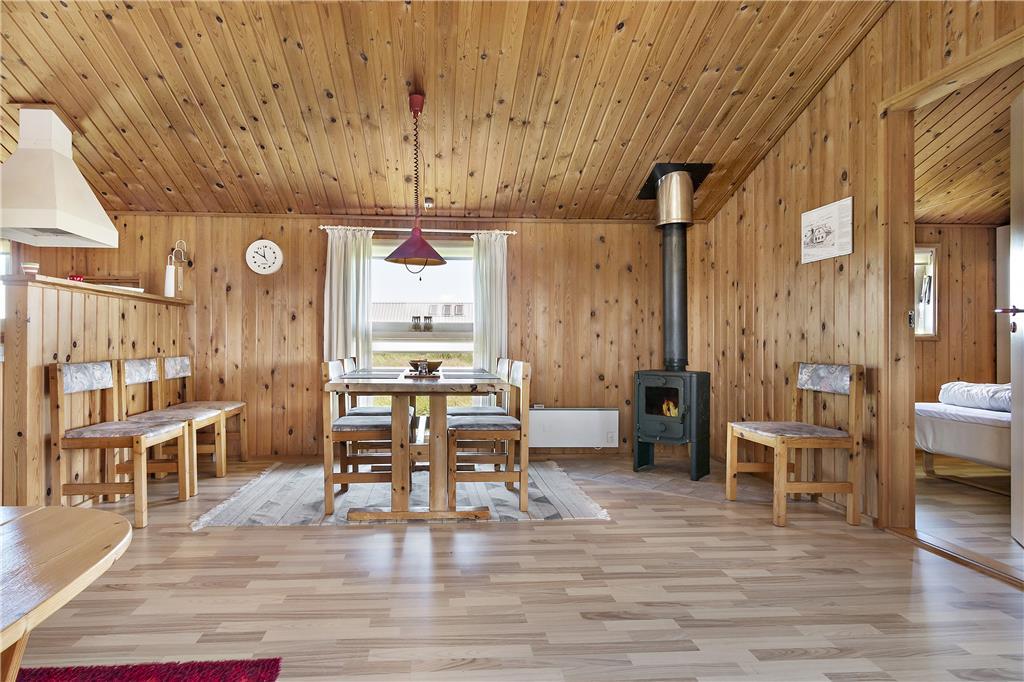 Det lyse og indbydte sommerhus byder på en dejlig planløsning, der skaber en følelse af rummelighed. Loftet til kip giver ekstra luft og lys i stuen, hvor den hyggelige brændeovn kan skabe varme og stemning på de køligere aftener. Husets tre værelser er perfekte til afslapning efter en aktiv dag i naturen, og det veludstyrede køkken giver dig mulighed for at tilberede lækre måltider, som kan nydes i den åbne opholdsafdeling. Fra stuen er der direkte adgang til husets terrasse, hvor du kan træde ud i det friske luft og mærke solen på huden.