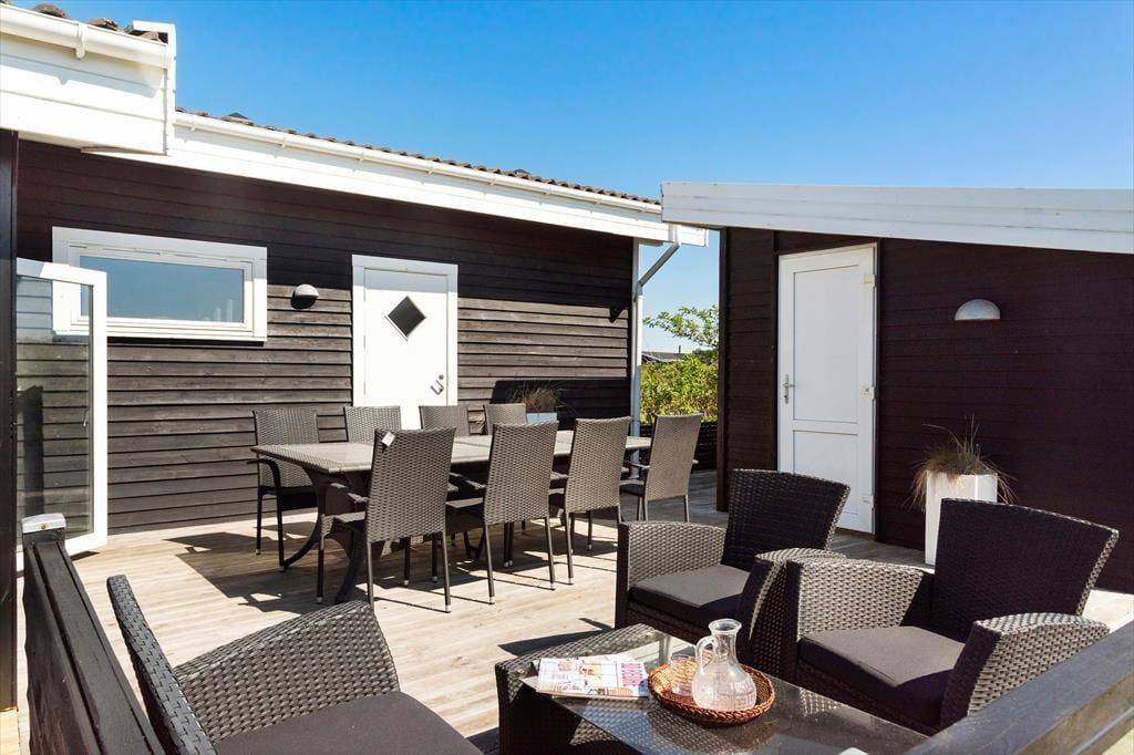 Et spændende indrettet feriehus med plads til to familier, med gode terrasser og i gåafstand til Vesterhavet.