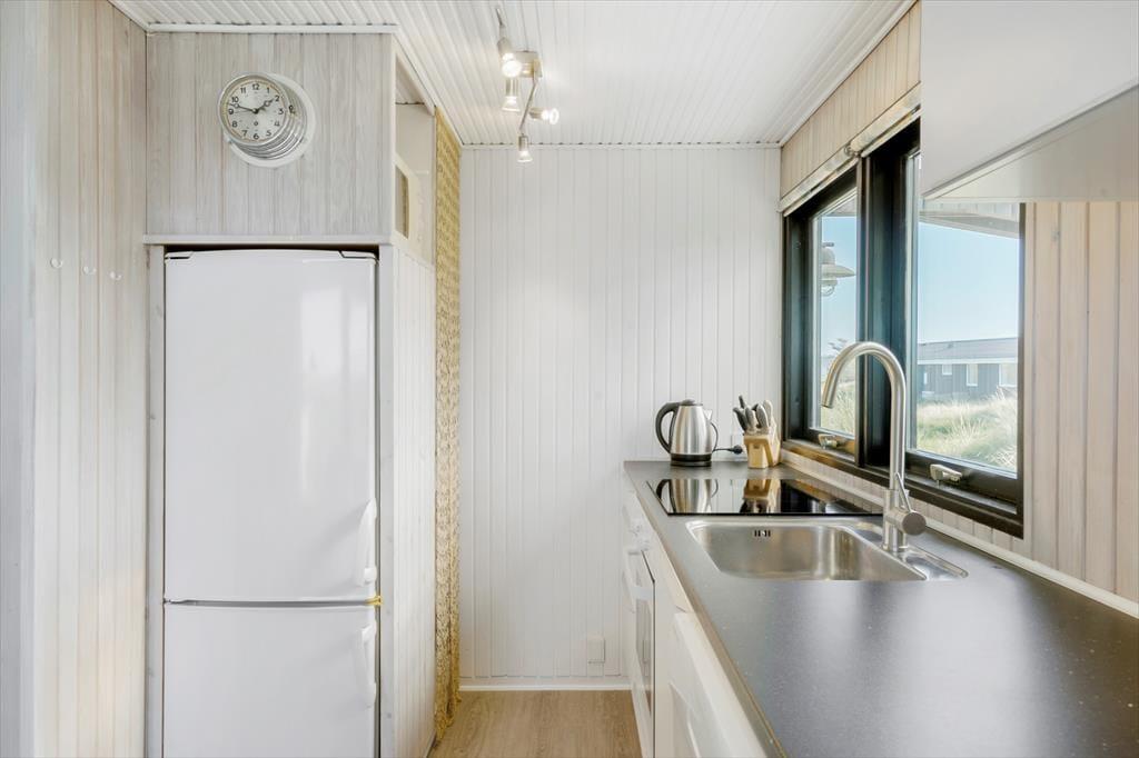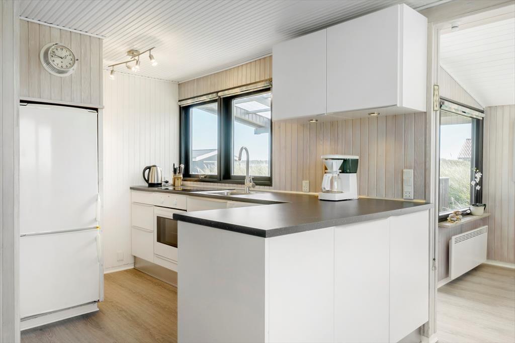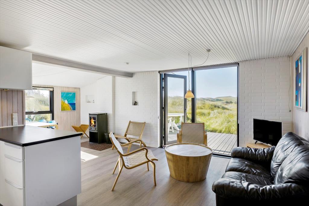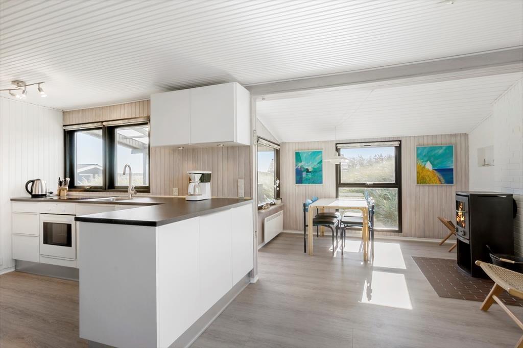 Dette hyggelige og velindrettede hus er 63 m2 og pga. størrelsen anbefales det derfor, at man kun medbringer én hund. Huset er lyst, velholdt og indrettet med et stort åbent rum, som både indeholder et funktionelt køkken, spiseplads ved den hyggelige brændeovn og et hyggeligt tv-hjørne. De mange vinduer lukker lyset ind og giver mulighed for at nyde den storslåede natur som huset er beliggende i – fra stuen er der direkte udgang til terrassen og klitterne. Der er to værelser til rådighed med henholdsvis dobbeltseng og køjesenge, så huset egner sig bedst til et enkelt par eller en lille familie, som vil hygge sig i hinandens selskab. Af tekniske hjælpemidler, er her både vaskemaskine, opvaskemaskine og gratis trådløst internet som kan gøre ferien lidt mere afslappende.