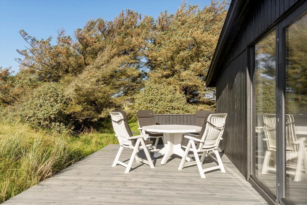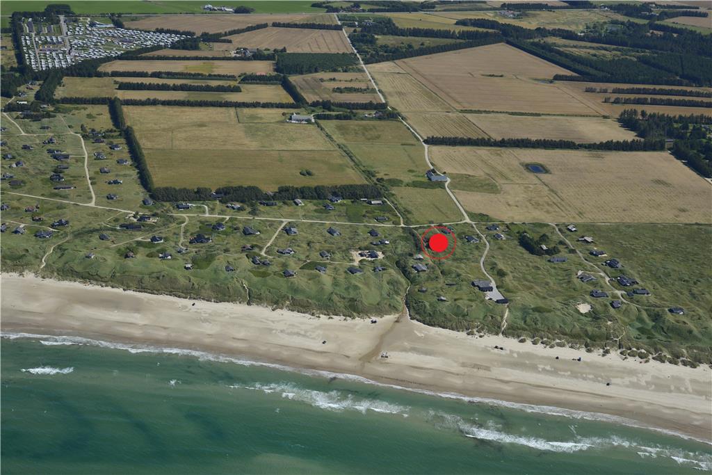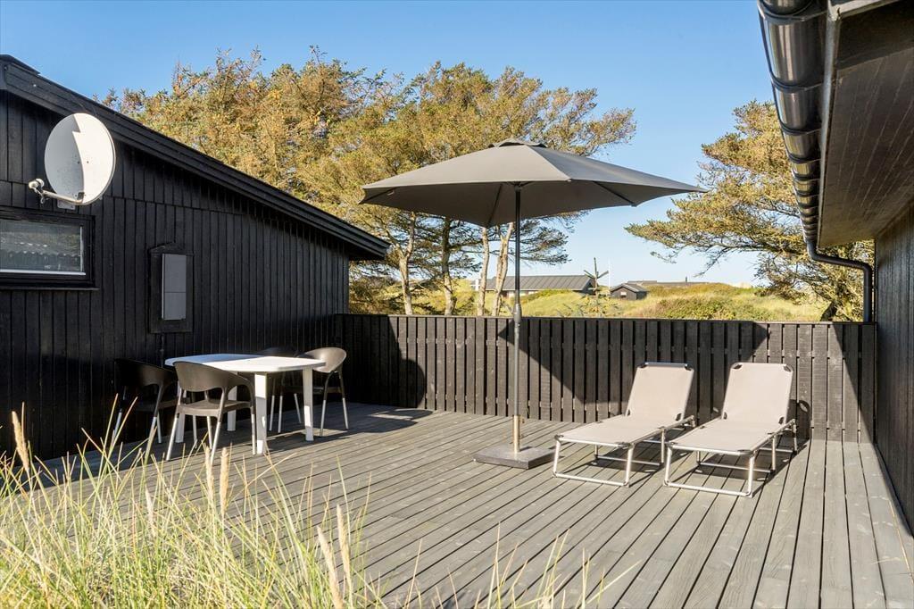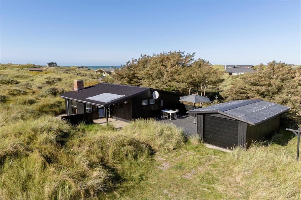 Huset er beliggende på en flot naturgrund midt i klitterne og har en dejlig udsigt over landskabet. Her er roligt, ugeneret og til Vesterhavet kan man følge en lille sti fra grunden ca. 200 meter. På begge sider af huset, er der gode terrasser og fra stuen er der udgang til en overdækket terrasse der indbyder til hyggelige grillaftener i læ for vinden. Her er havemøbler, grill og liggestole til rådighed.