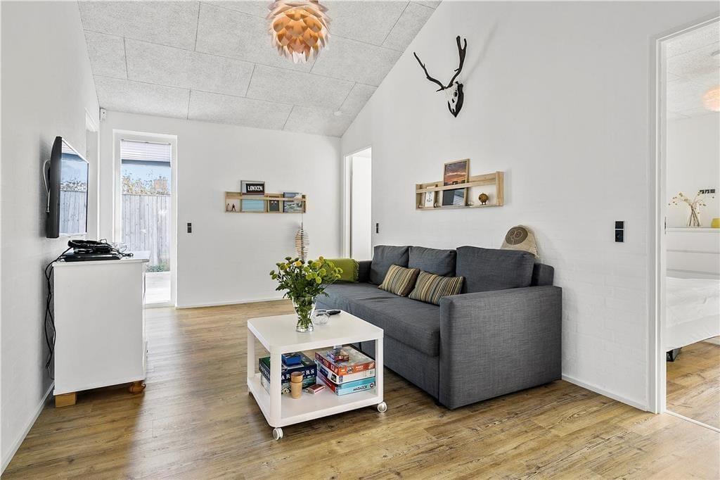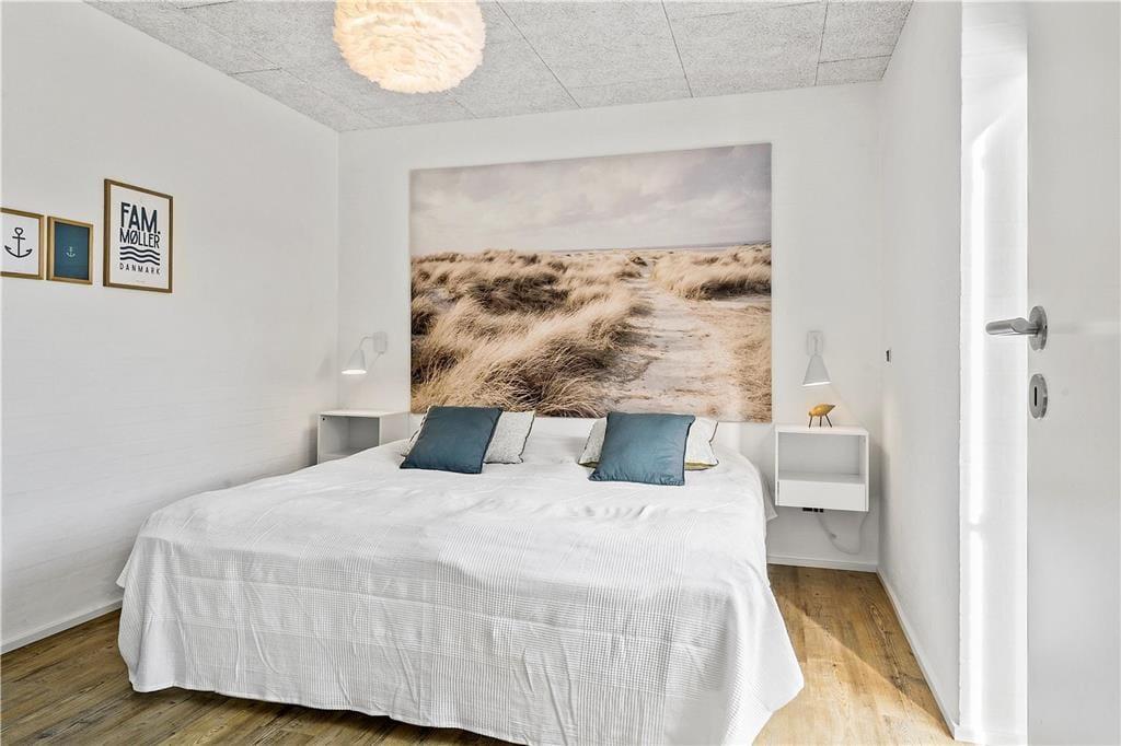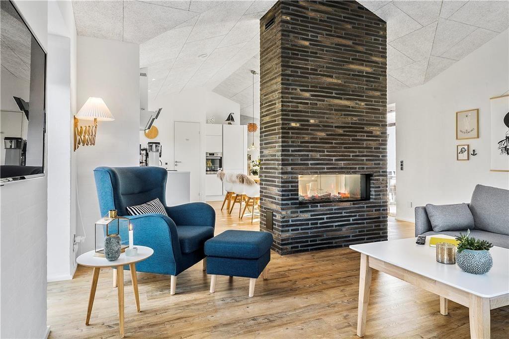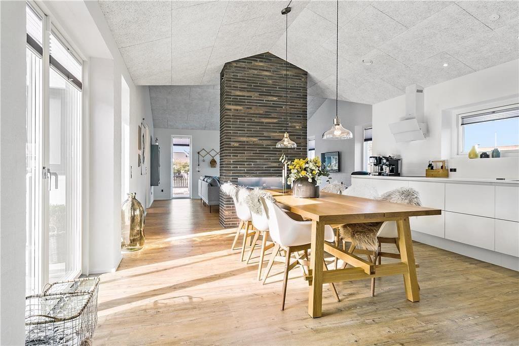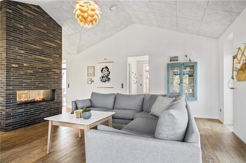 Der er kælet for alle detaljer i dette hus, som er opført i en enkel og tidløs arkitektur med rolige flader og store vinduespartier. Indenfor er der en utroligt lys og venlig atmosfære, som skaber gode rammer om ferieturens hyggelige samvær. Det kan I blandt andet se frem til at nyde i det store køkken-alrum, der tilbyder god plads til de kulinariske udfoldelser – og et stort spisebord til at servere dem på. Mellem alrum og stue er der en muret dobbeltsidet pejseindsats, som sender varme og hygge til begge sider – en helt unik detalje, der gør det til en særlig oplevelse at sidde i sofaen, når aftenen er faldet på. I huset er der endvidere tre soverum med dobbeltseng samt en sovesofa til to personer. Endelig er der to badeværelser og et bryggers.