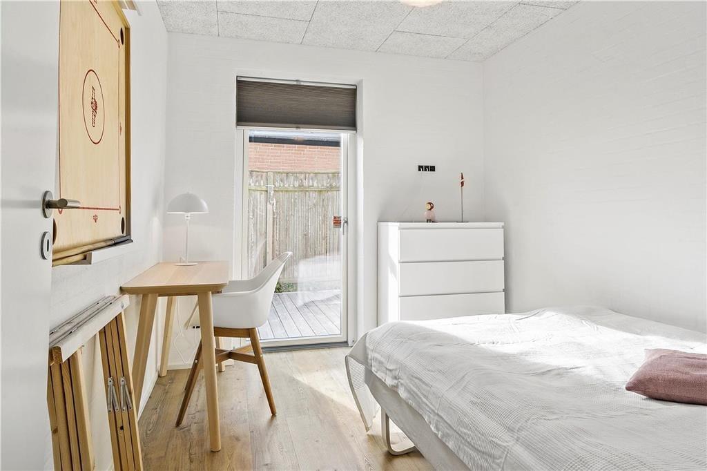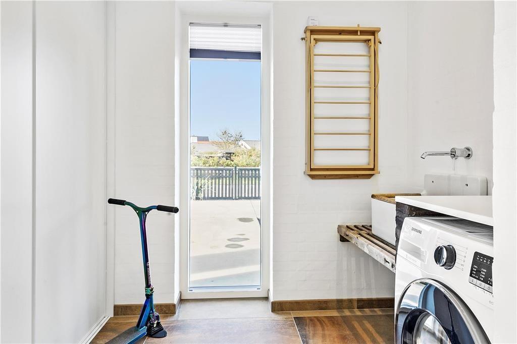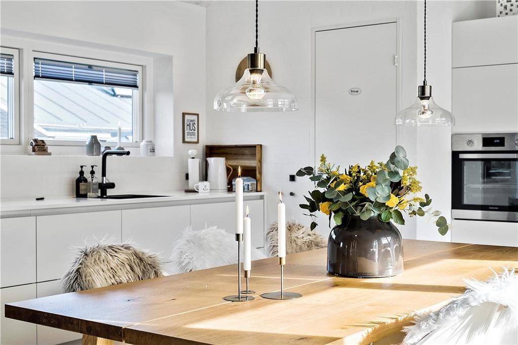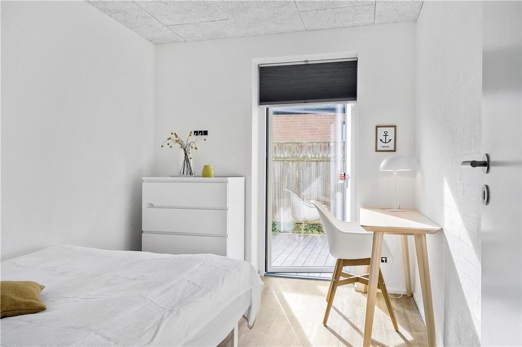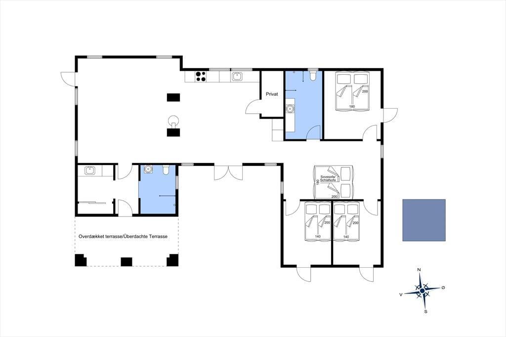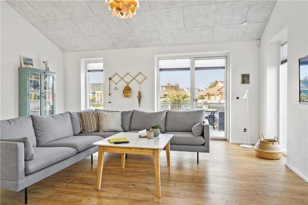 Der er kælet for alle detaljer i dette hus, som er opført i en enkel og tidløs arkitektur med rolige flader og store vinduespartier. Indenfor er der en utroligt lys og venlig atmosfære, som skaber gode rammer om ferieturens hyggelige samvær. Det kan I blandt andet se frem til at nyde i det store køkken-alrum, der tilbyder god plads til de kulinariske udfoldelser – og et stort spisebord til at servere dem på. Mellem alrum og stue er der en muret dobbeltsidet pejseindsats, som sender varme og hygge til begge sider – en helt unik detalje, der gør det til en særlig oplevelse at sidde i sofaen, når aftenen er faldet på. I huset er der endvidere tre soverum med dobbeltseng samt en sovesofa til to personer. Endelig er der to badeværelser og et bryggers.