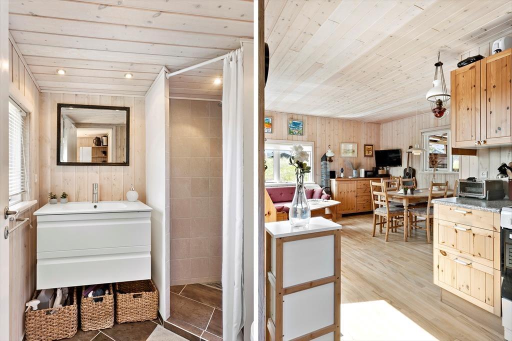 Indenfor byder sommerhuset på en lys og indbydende indretning, hvor den hyggelige atmosfære virkelig kan mærkes. Det åbne køkken er ideelt til, at du kan tilberede dine yndlingsmåltider, mens du stadig er en del af samtalen i spisestuen og stuen. Her kan du nyde samværet med dem, du holder af, mens roen sænker sig over hele huset. Sommerhuset rummer to gode værelser og et badeværelse, som indbyder til afslapning og komfort. Bemærk, at der ikke er tv-kanaler i huset, men et tv og dvd-afspiller er tilgængelige, hvis du har lyst til at se en god film om aftenen.