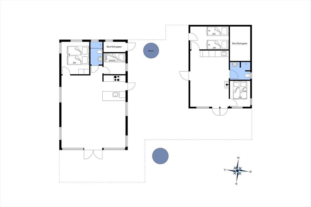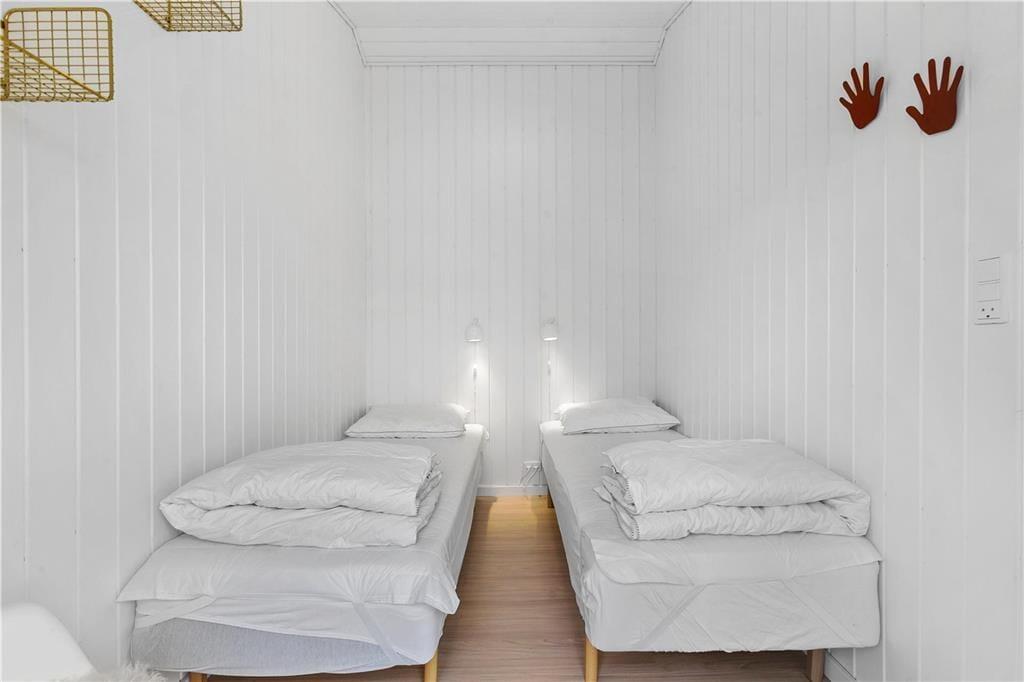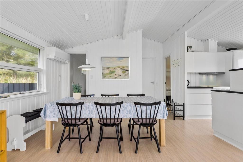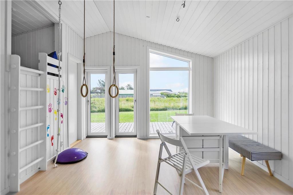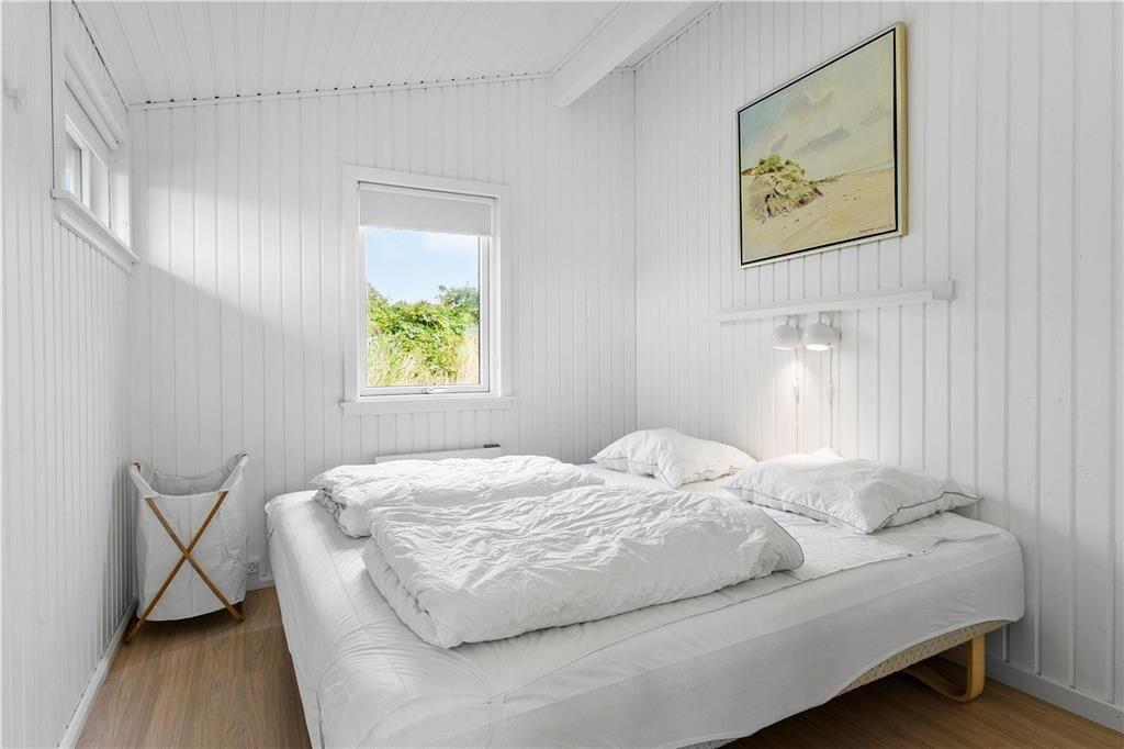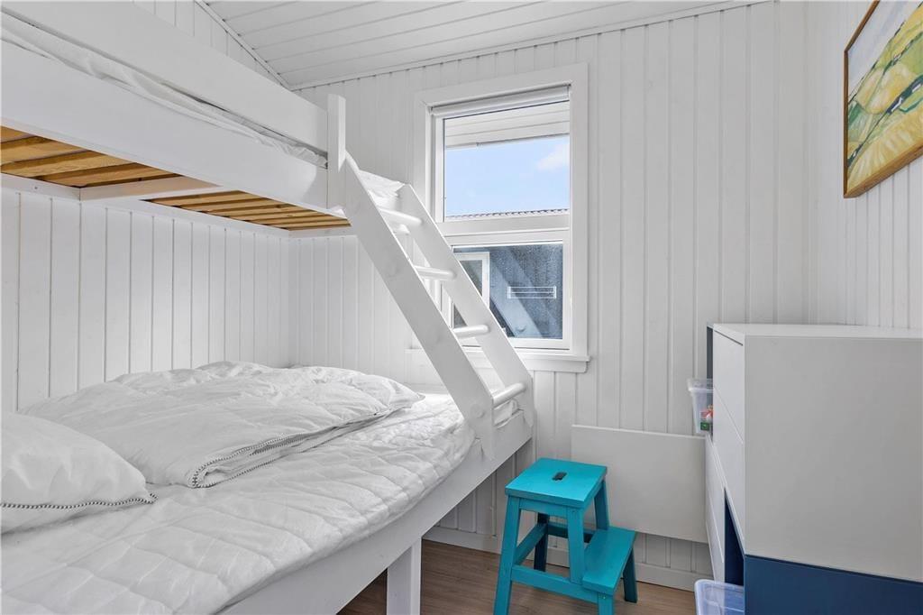 Lys, enkel og indbydende – sådan kan indretningen af det velrenoverede sommerhus såvel som annekset kort beskrives. I begge bygninger er der loft til kip og hvidmalede trævægge, som giver rummene et klassisk sommerhuspræg. Og takket være de store vinduespartier får I glæde af dagslyset, når I hygger jer inden døre med brætspil, lækre middage og tilbagelænet sofaafslapning. Hovedhuset byder på et opholdsrum med integreret køkkenafdeling, et badeværelse og to soveværelser, hvoraf det ene er udstyret med dobbeltseng. I det andet står en ¾-seng, og over den har I en ekstra sengeplads i køjen. Har I inviteret venner eller familie med på ferie, kan de se frem til at drømme sødt i de to enkeltsenge eller i alkove sengen i anneksets soveværelser. Annekset har desuden eget badeværelse med brusefaciliteter samt et tekøkken med køleskab, og så er der for øvrigt gymnastikringe og klatretov til børn og barnlige sjæle.