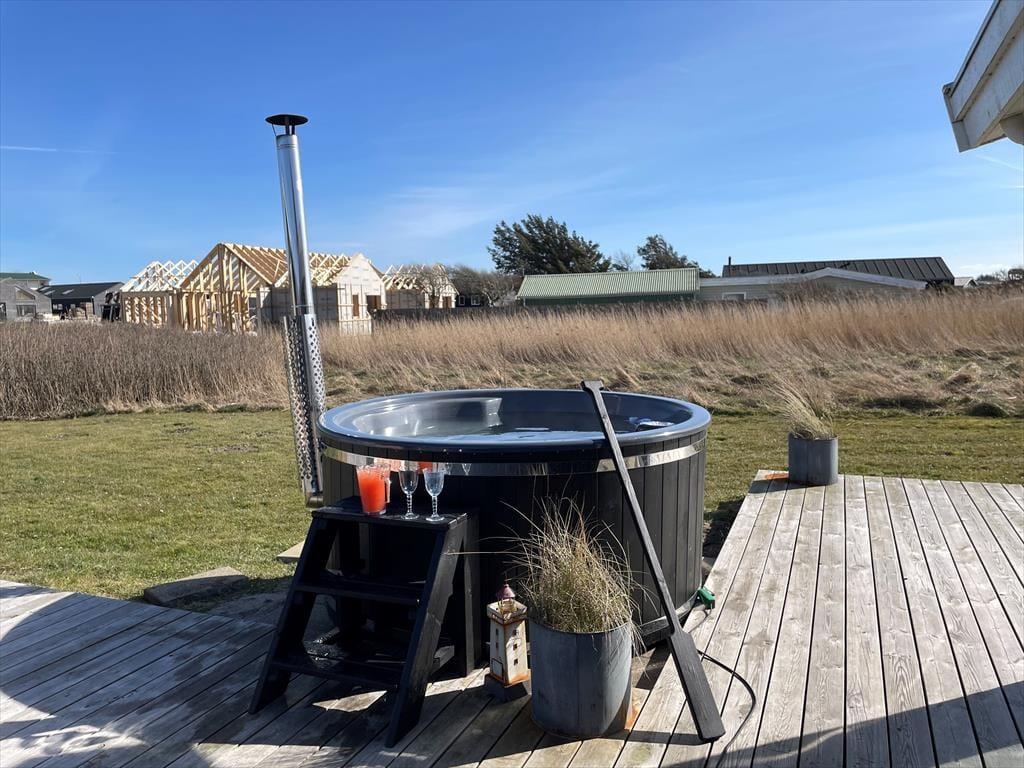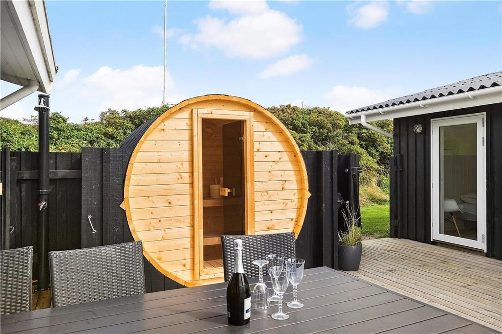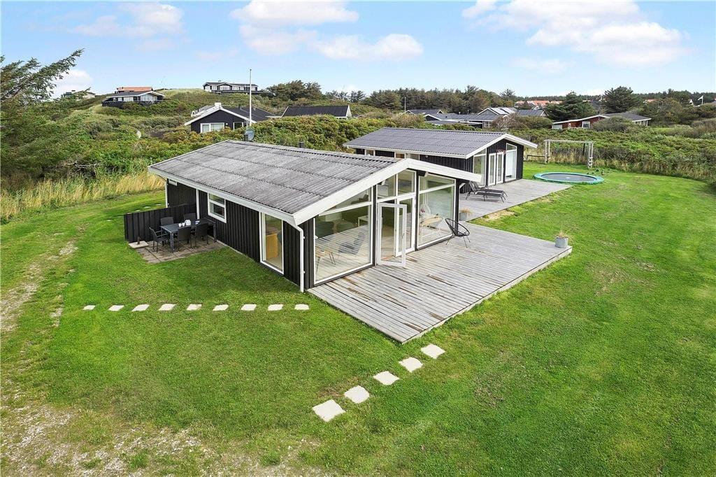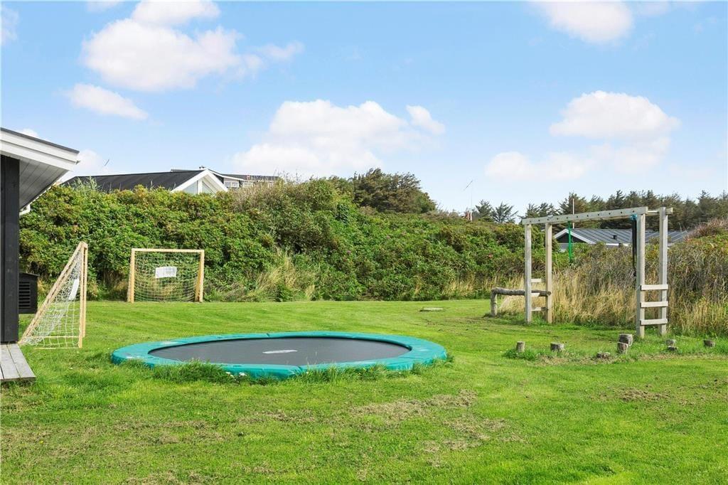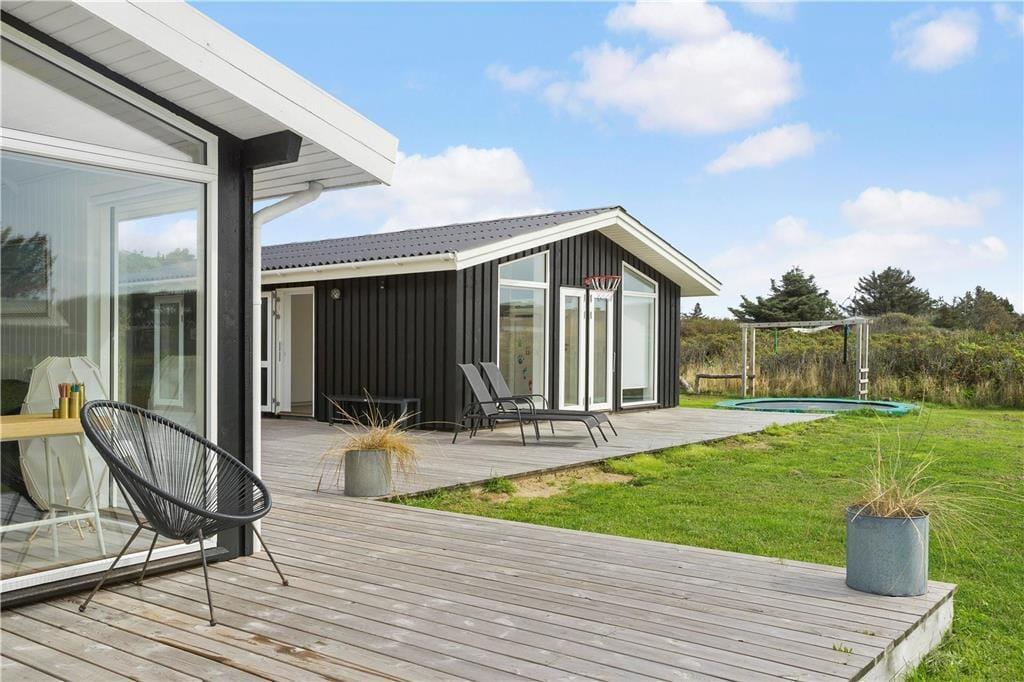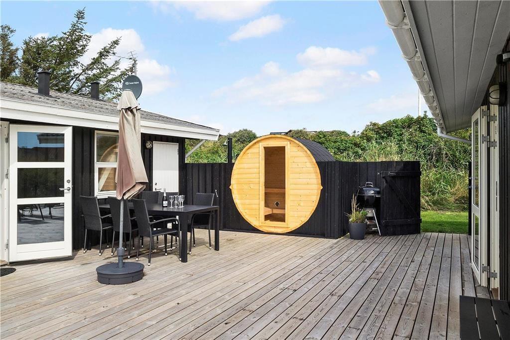 Ude i det fri har I også rig mulighed for at lege og nyde ferielivet i stor stil, for der er blandt andet trampolin og fodboldmål på den 2000 m2 store grund. Vil I helst bare koble af i solen, er den kæmpestore træterrasse perfekt til formålet. Alt efter solforholdene og jeres præferencer kan I sætte jer på det sydvendte terrasseområde eller i smørhullet mellem sommerhuset og annekset – og her står der endda en udendørs sauna, så I kan blive varmet igennem, når I vender hjem efter en frisk dukkert i Vesterhavet.