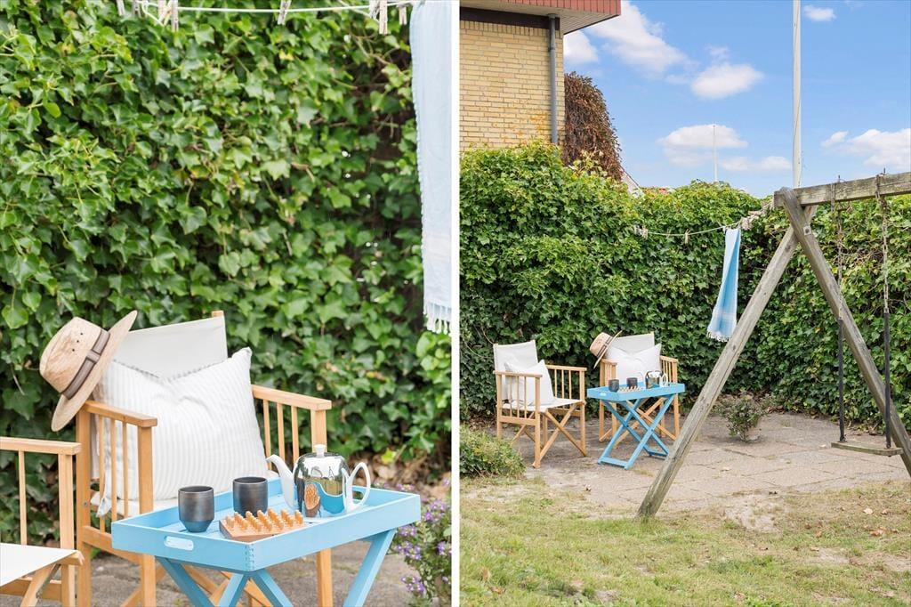 Den hyggelige havegrund er kuperet, så der går en trappe fra garagen og op til huset. I skal endnu et par trin op, før I kommer til husets skønne, sydvendte terrasse, som omkranses af stakit og læ givende afskærmning. Havemøbler, liggestole og grill er naturligvis til rådighed, så I kan nyde ferielivet i stor stil.