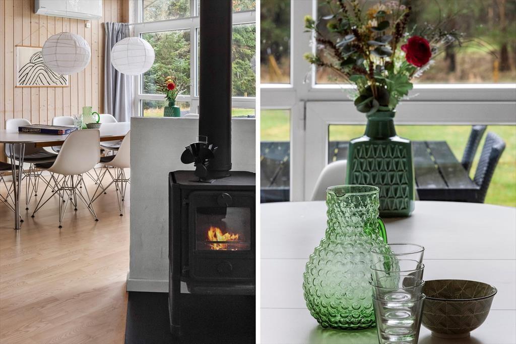 Når du træder ind i sommerhuset, vil du straks mærke den lysfyldte og indbydende atmosfære. Huset er indrettet med store vinduer, der trækker den omkringliggende natur ind i stuen, og de høje lofter giver rummene en ekstra følelse af plads og luftighed. Køkkenet er åbent og i perfekt forbindelse med opholdsstuen, hvor du kan sidde og nyde udsigten til den smukke natur omkring huset. Her er der plads til samvær, uanset om du laver mad i det veludstyrede køkken eller slapper af foran den åbne stue. Sommerhuset rummer tre gode soveværelser og et badeværelse, som gør det muligt for hele familien at opholde sig komfortabelt under ferien.