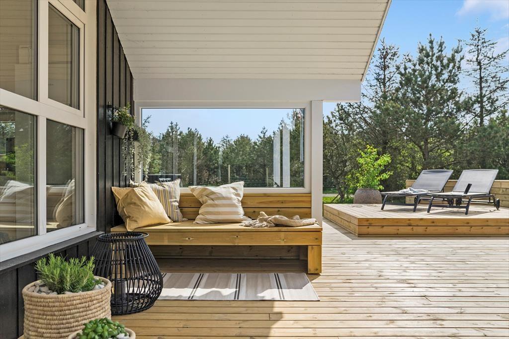 Et herligt terrassemiljø smyger sig rundt om tre sider af sommerhuset. Mod syd er terrassen overdækket, og en glasvæg skærmer af mod vest, så I kan sidde i læ, når I griller, læser avis eller får en middagslur i havestolene. Takket være randbeplantningen er grunden i det hele taget ret læfyldt og ugeneret, og så er der for øvrigt carport til bilen.